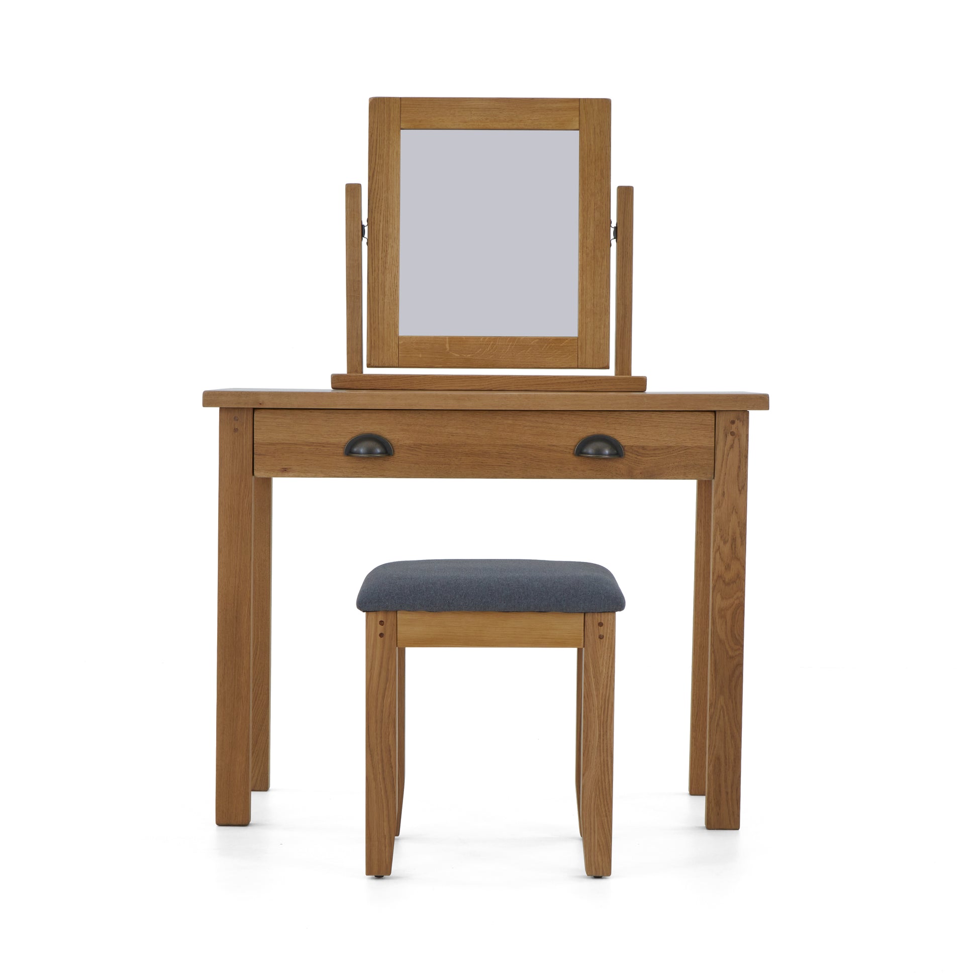 This dressing table set is made up of three items being the swivel mirror, stool and table itself. Made from Oak timbers it has a distressed hand waxed finish and exposed dowel peg heads along with shaker style legs. These design features really do enhance the beauty of the natural wooden grain. It comes with both the cup & knob style handles for the drawer so that you can choose the one suitable for your room.