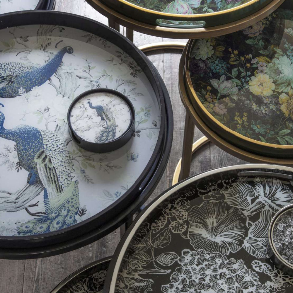 Stylish and practical set of two nesting tables with removable trays, mounted on gold painted metal frames. Large 48W X 48D X 69H, Small 39W X 39D X 56H cm. This stunning Belvedere design by Laura Ashley features two peacocks surrounded by an attractive deep blue frame. Large tray measures 48W X 48D X 69H cm and Small 39W X 39D X 56H cm. Total height 69cm. Part of a collection of tables, placemats, trays and coasters featuring the same design.