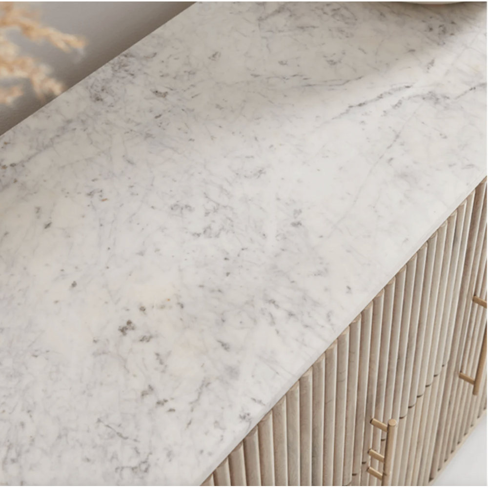 Celebrating the raw beauty of natural materials in an unapologetically contemporary design that speaks for itself, the Rochelle Mango Wood & Marble Wide Sideboard is a marvel to behold with its visually striking, modern design that is sure to take pride and place in any dining room or living area. Defined by a remarkable reeded carcass, crafted from a stunning, natural mango wood with a white wash finish, the Rochelle has a certain charm that is sure to enhance its surroundings. The soft, rounded edges and outline lend this sideboard an almost light and airy quality, whilst the polished finish of the refreshing white marble top further adds to the allure of this piece. Accompanied with its cupboards, gold bar handles and matte black metal legs, with a touch of gold on the top for a hint of exquisite detail, the Rochelle Sideboard offers plenty of storage in an attractive design with luxe and industrial appeal
