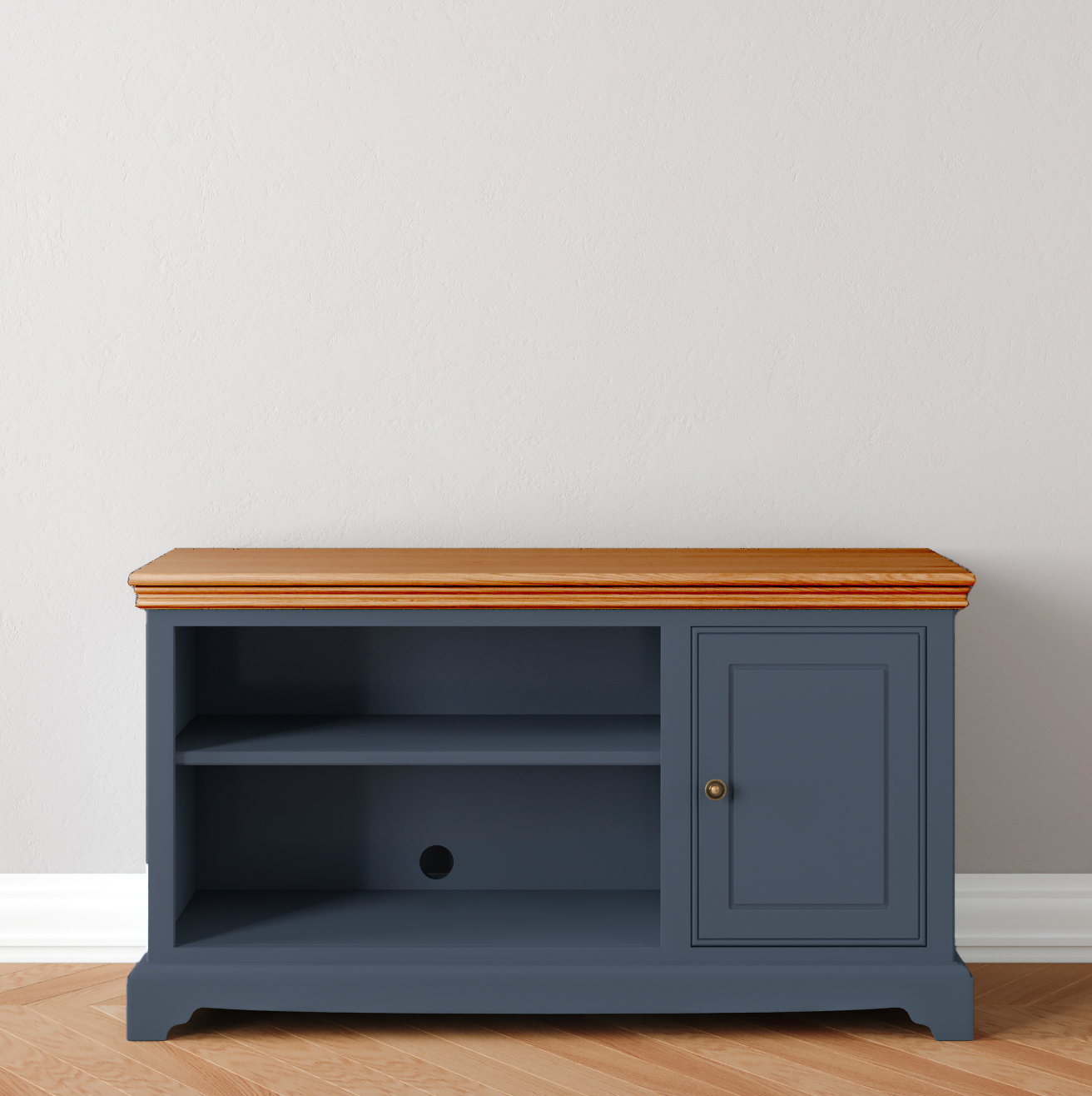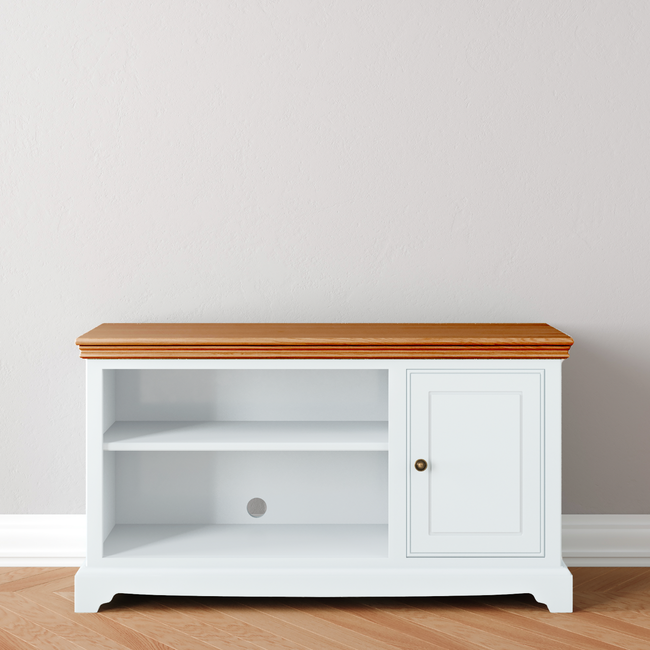 Classic format TV and Media unit with a side cupboard for additional storage. Fully adjustable shelves will allow you to accomodate most configurations of media boxes.