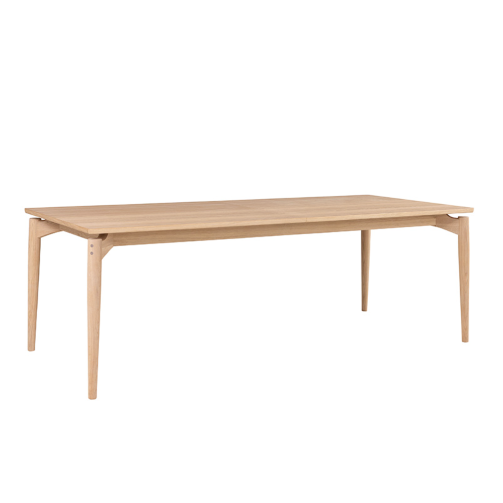 Rectangular dining tables with floating table top with solid edges. Aeris has rounded and tapered solid legs.