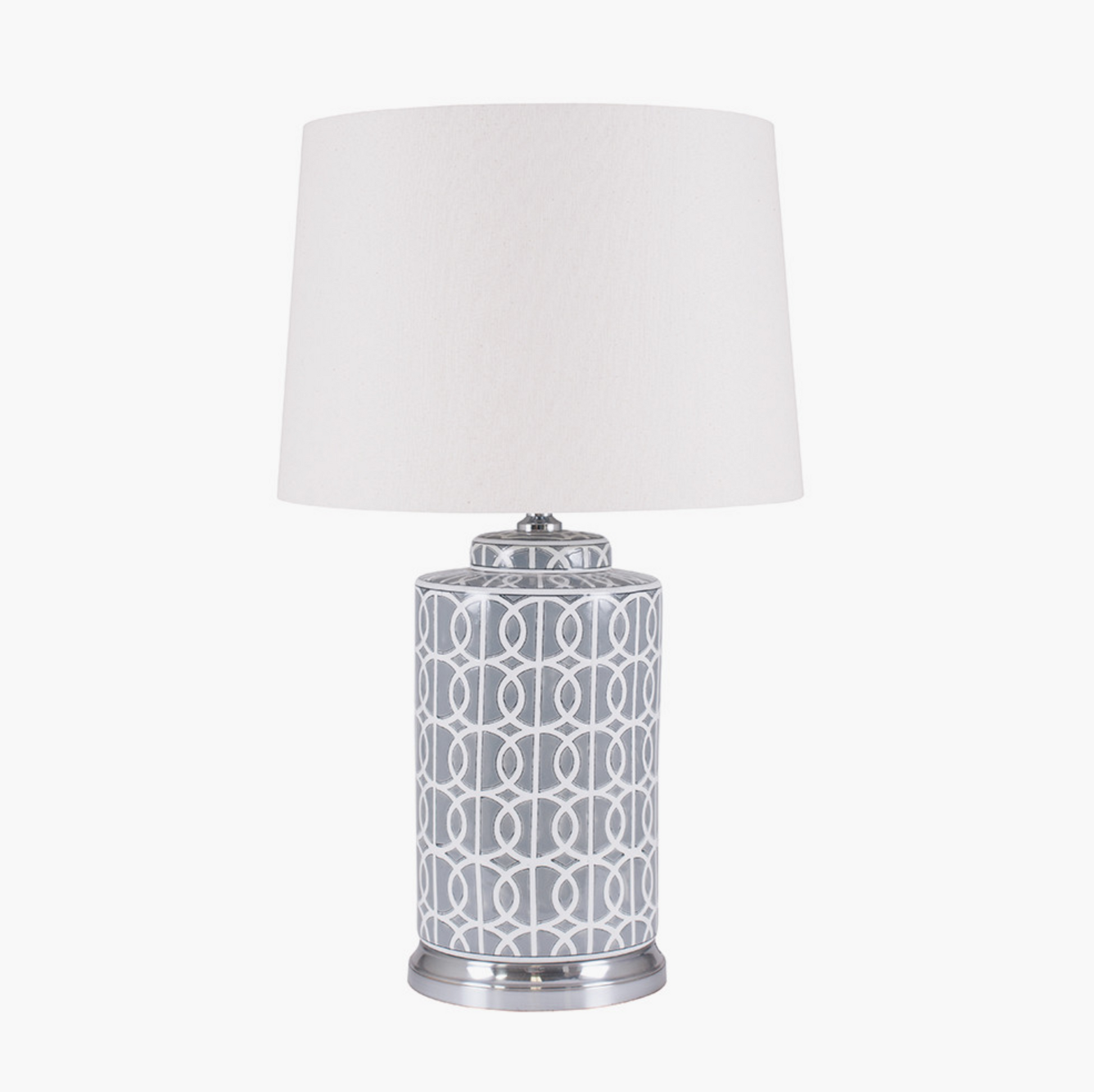 Ceramic lamp with bold geometric grey and white pattern finished with a metal base. Comes complete with textured cotton tapered cream shade. This stunning lamp also comes in a smaller size.