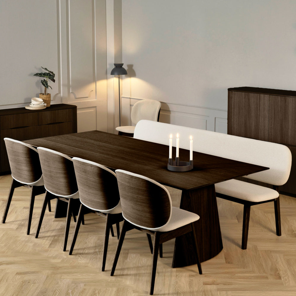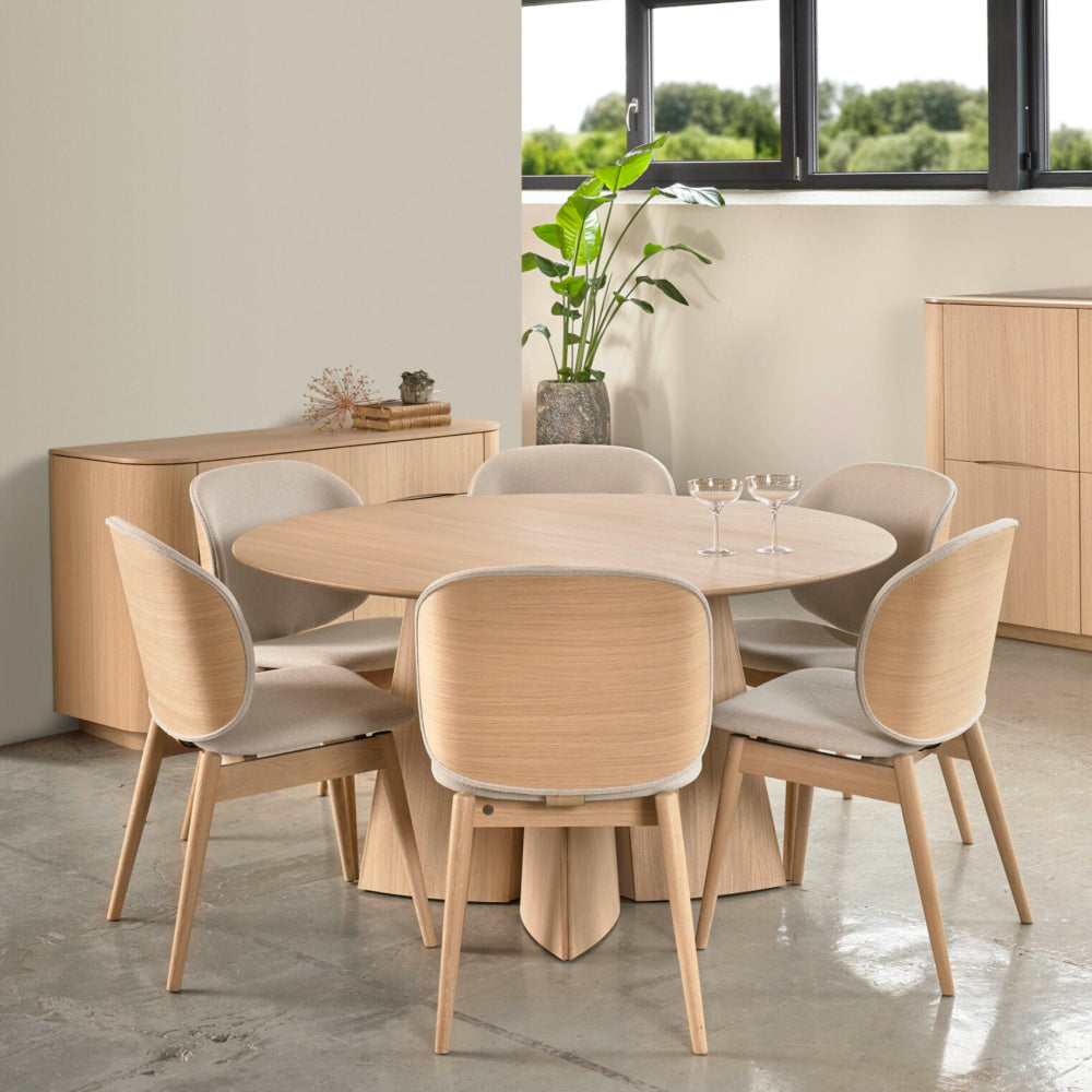 This Scandi inspired chair is carefully crafted from solid wood, walnut oil and upholstered in a quality leather of your choice, perfect for paring with the Fusion Dining Table.