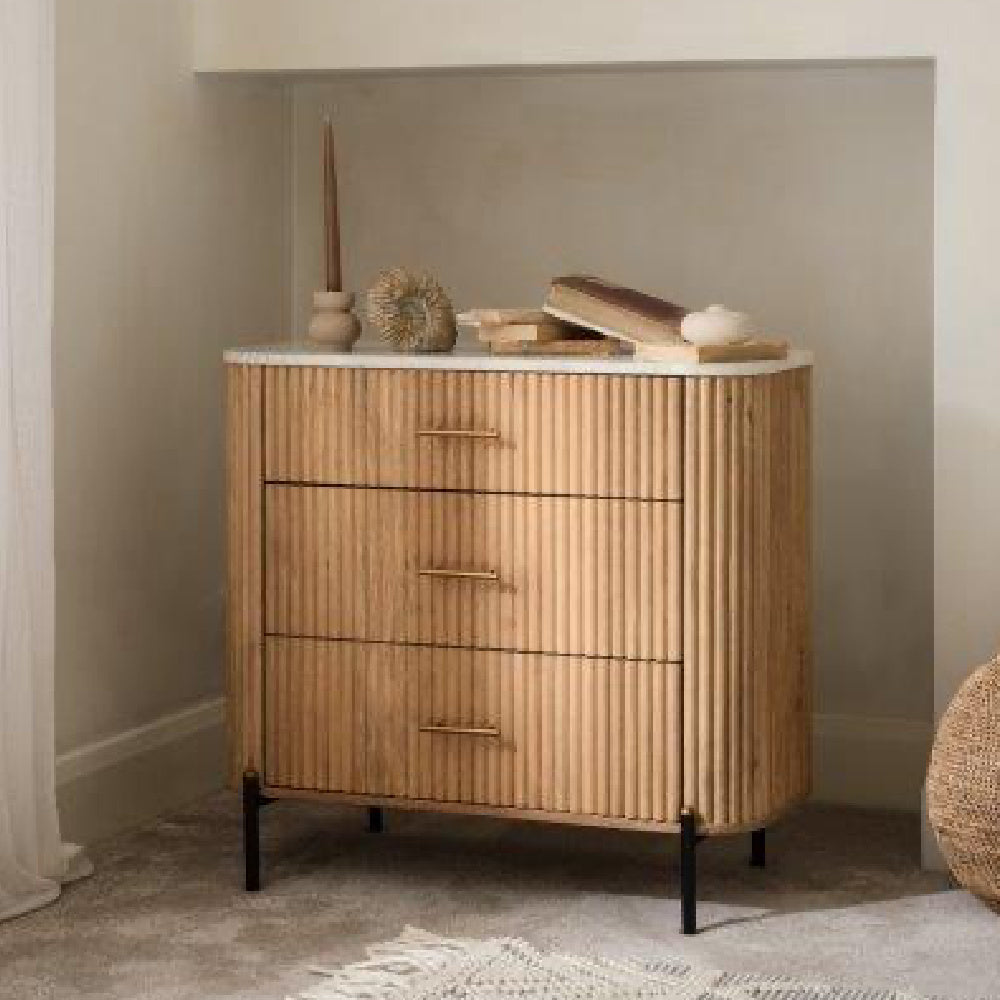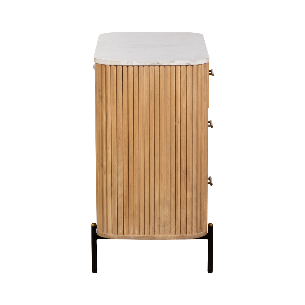 Experience the breathtaking blend of raw, natural materials and modern design in the Reed Mango Wood & Marble 3 Drawer Chest. This stunning piece exudes a sense of contemporary elegance and is the perfect addition to any bedroom.