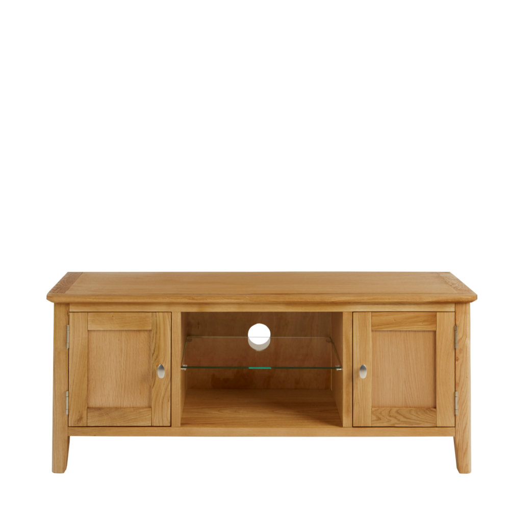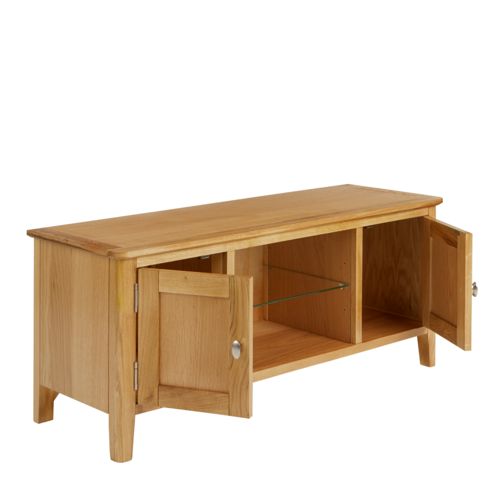 The Bath collection is lacquered in a pale oak colour which would compliment any interior decor. The pale finish will help brighten your living area creating a calming ambience. The curved legs and corners help add individuality to the pieces along with the Satin Silver handles, giving this range a contemporary, modern feel. The Large TV Unit is a great occasional piece for any living space with the additional storage space of the 2 small cupboard and central glass shelf. The Large TV Unit will help finish off your living space beautifully. The curved legs and corners, along with the Silver Satin handles add to the beauty of the range.