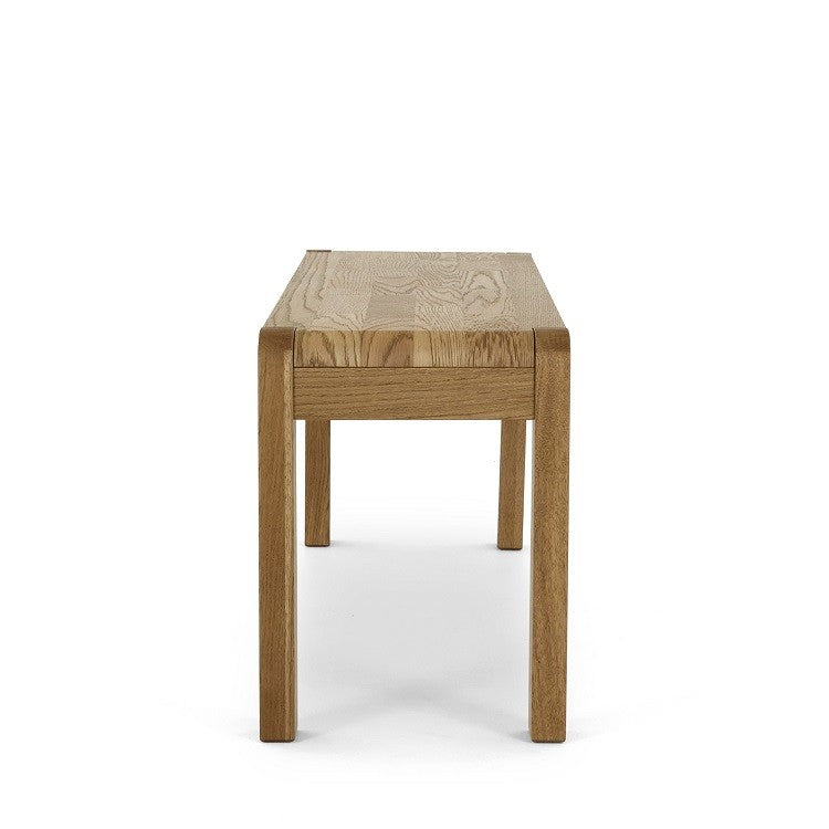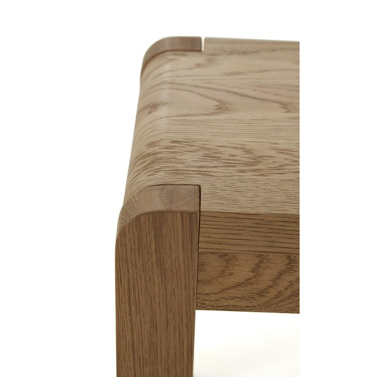 Made from Oak this is the Corndell Bergen collection bench which can be used with the dining tables. It is finished in clear lacquer which allows the grain of the timber to show. The top is thick and a butchers block style which has rounded corners to soften the lines.
