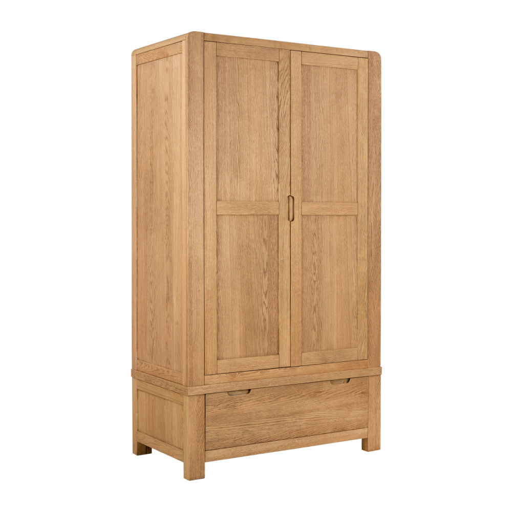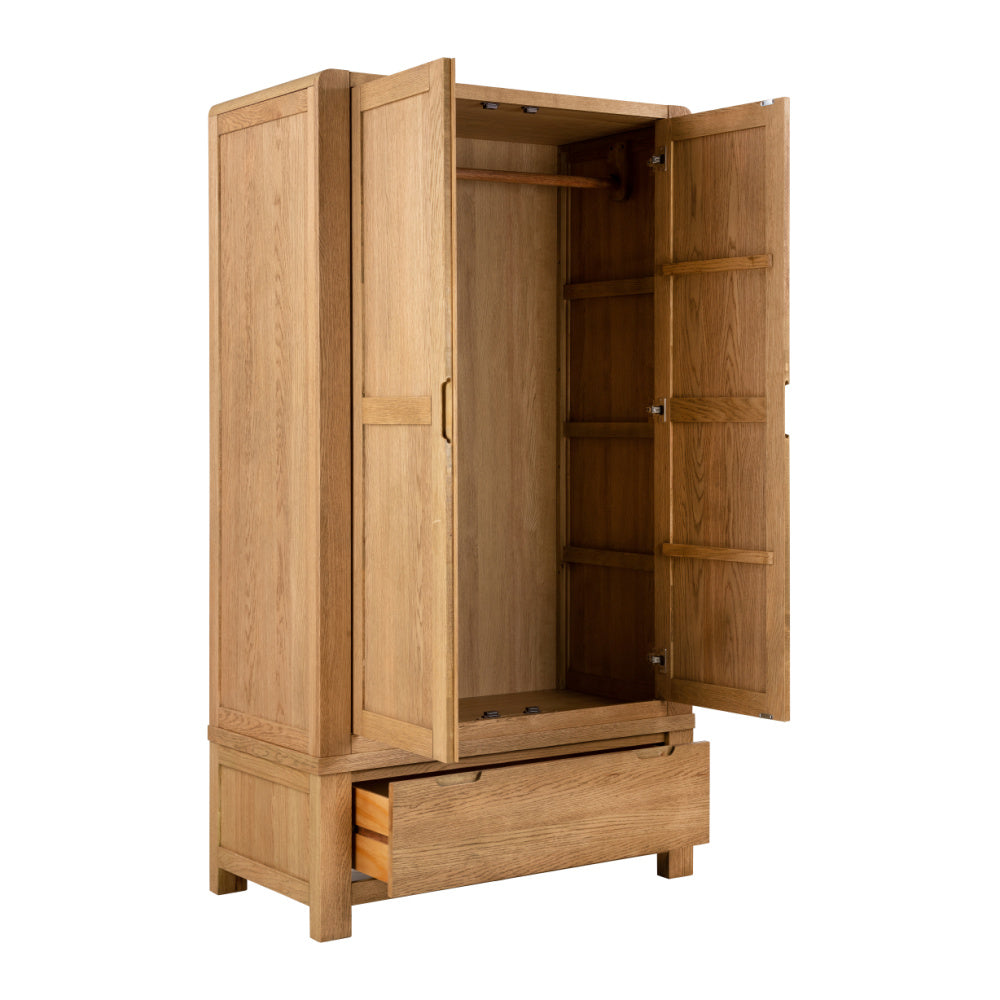 Indulge in elegance with the Bergen Double Wardrobe, a practical yet stylish storage solution. Featuring ample hanging space and a deep drawer, this wardrobe is perfect for any bedroom. Its sleek and neutral Scandinavian design is versatile and can be easily broken down for staircase access. Dimensions - W: 109cm / H: 196cm / D: 58cm.