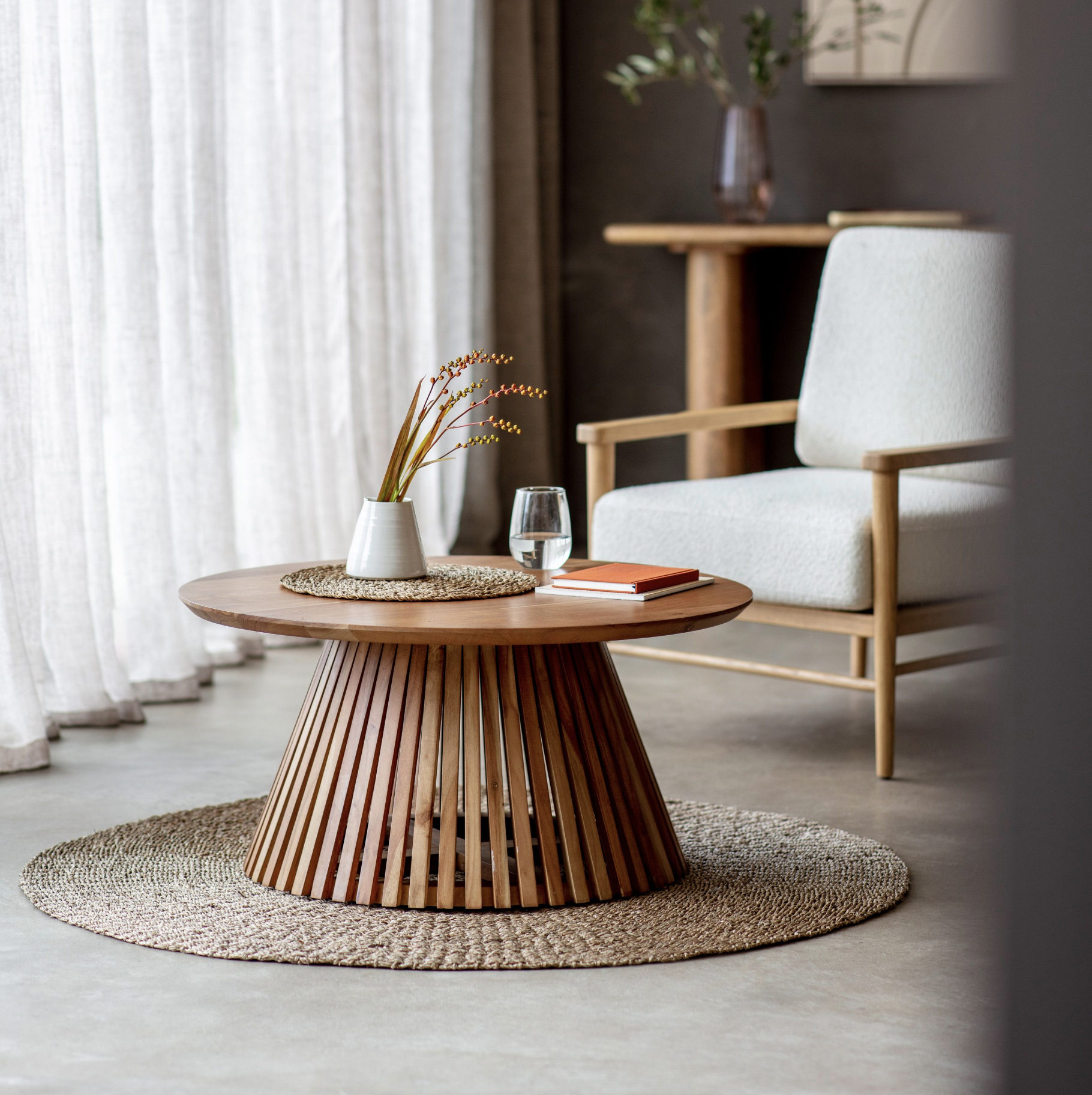Add a stylish contemporary look to a room with this stunning coffee table. The base features gently sloping wood slats which create a stunning design feature. The table is crafted from solid acacia wood in a natural finish to show the grain of the timber. A matching dining and side table are also available.