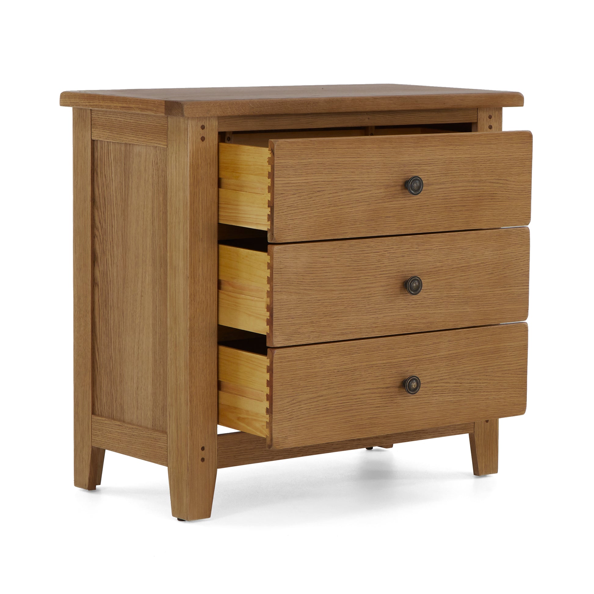 This is a three drawer bedroom chest which has a hand waxed finish and design details such as shaker style legs and gently rounded corners on the top. Each chest comes with both cup and knob handles therefore giving a choice of what suits the room it is for best. There are exposed dowel pegs across this collection and all the drawers have dovetail joints for added strength.