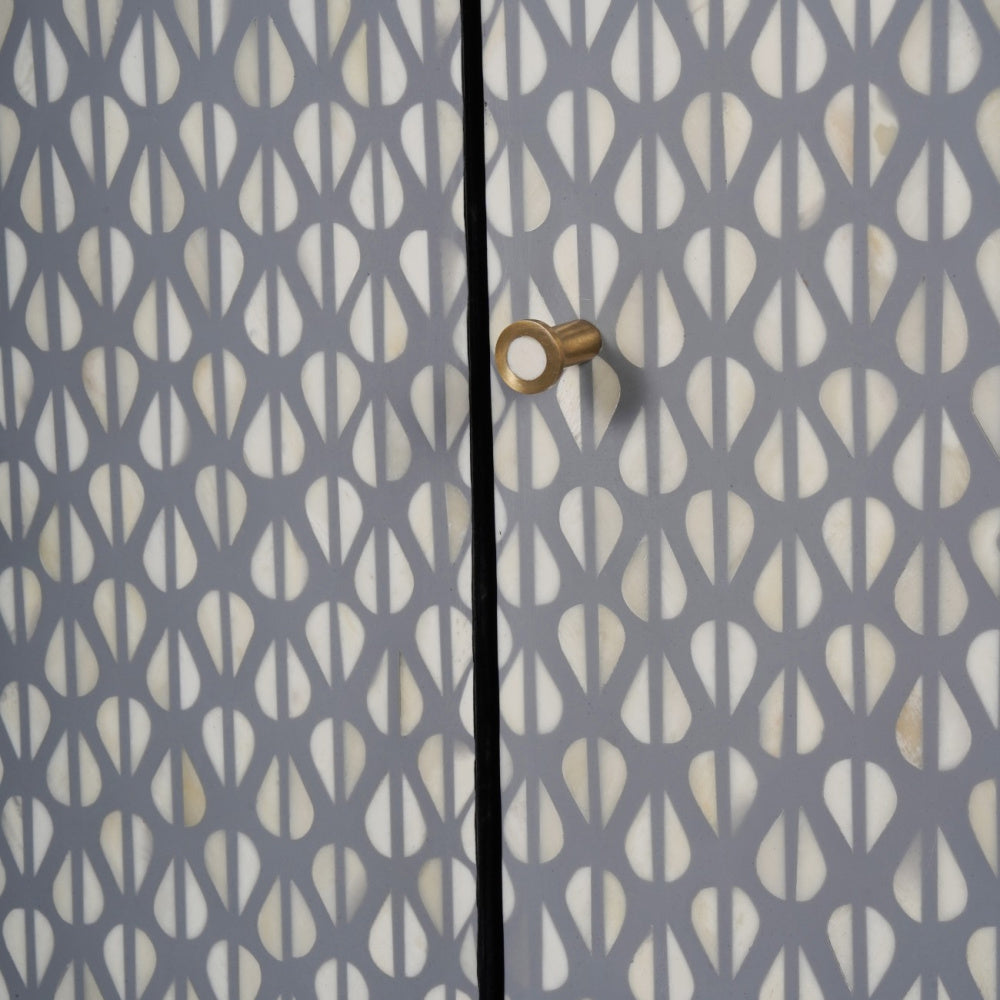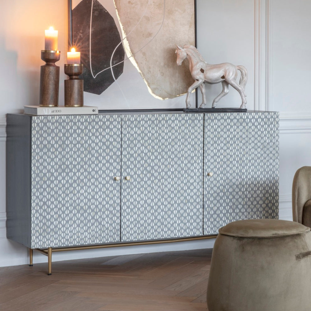 The Burgess Bone Inlay Three Door Sideboard is a masterfully crafted cabinet that effortlessly blends contemporary design with traditional craftsmanship. Adorned with meticulously hand applied bone inlay, its intricate pattern in grey and white tones takes centre stage. The subtle antique brass finished handles are thoughtfully integrated, enhancing the design without overshadowing the beauty of the bone inlay. Supported by slender, antique brass finish metal legs, this stylish sideboard offers both elegance and practicality. The Burgess collection, which includes a Two Door and One Drawer Bedside, allowing for a cohesive look throughout your home