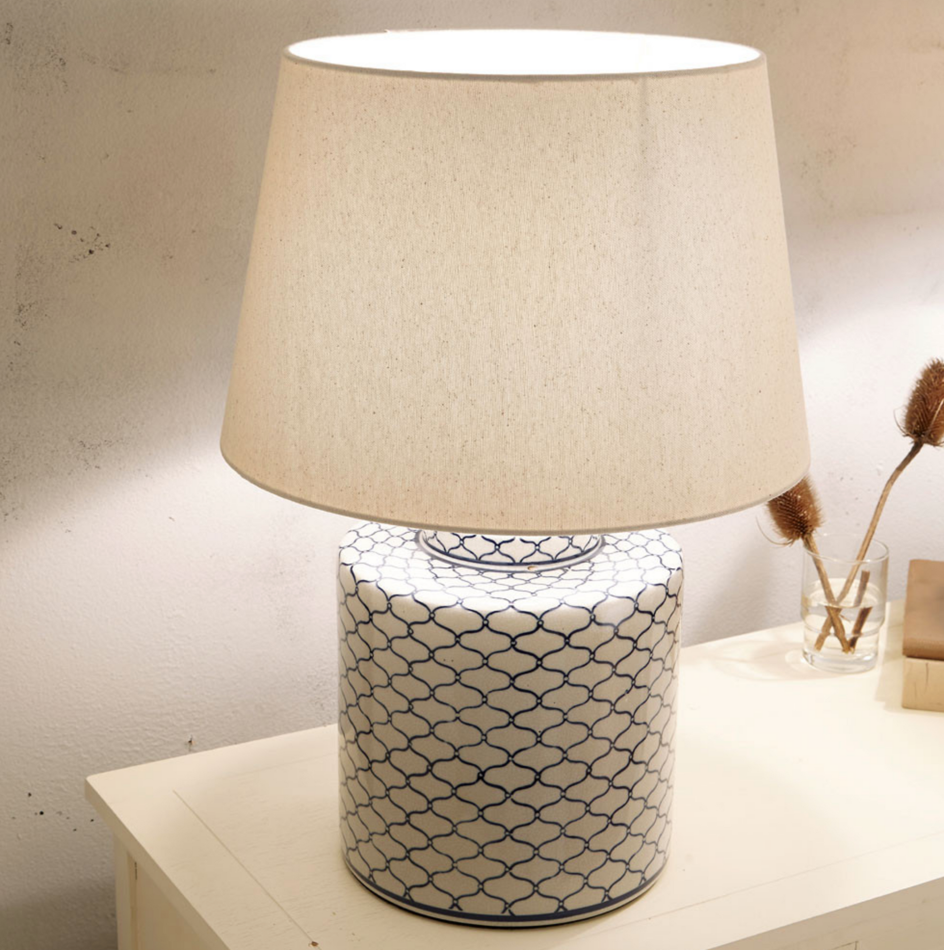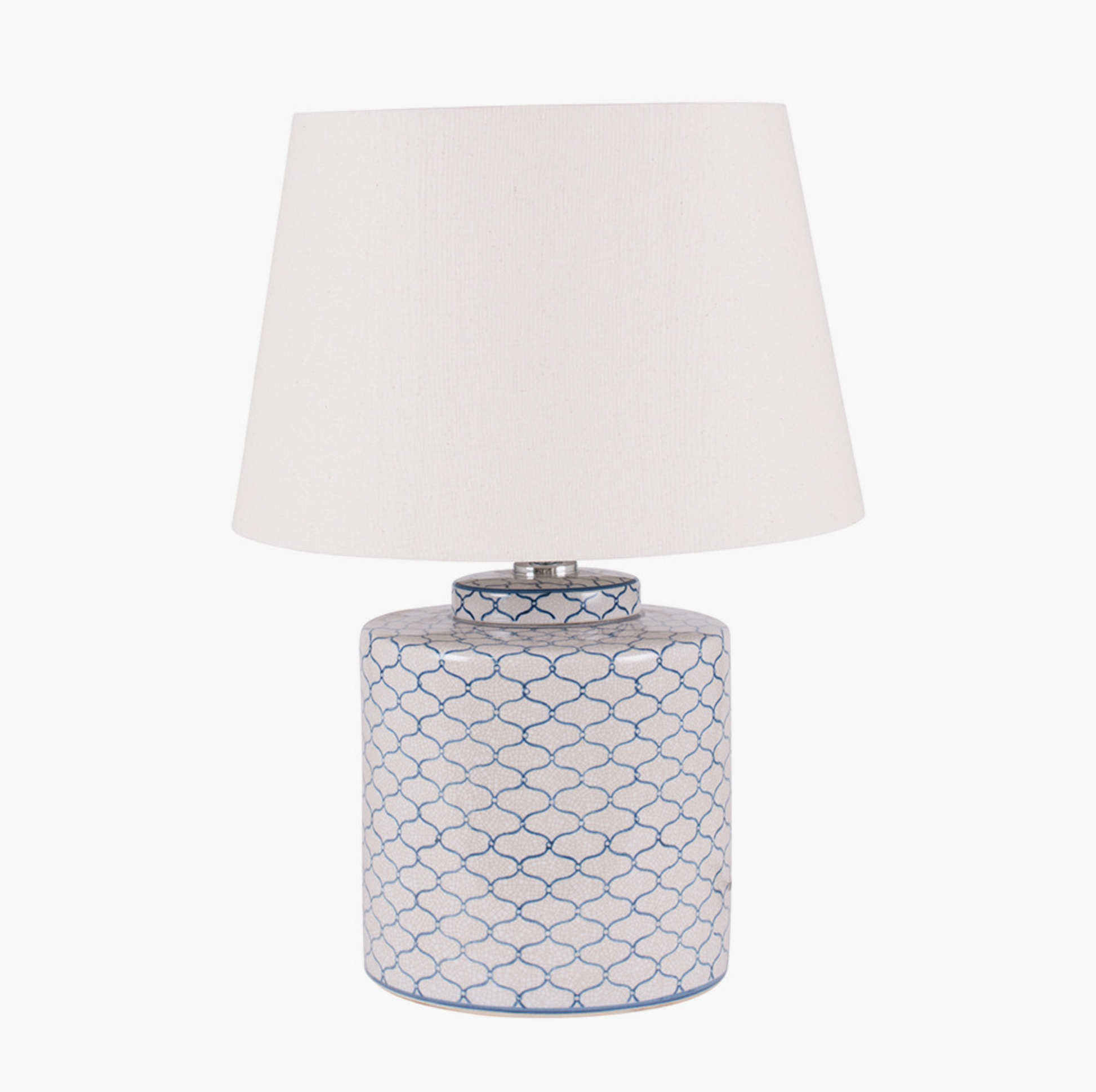 A tea caddy shaped ceramic pot with a geometric blue design repeated against a light grey background. This lamp comes complete with a tapered slubby cotton cream shade.