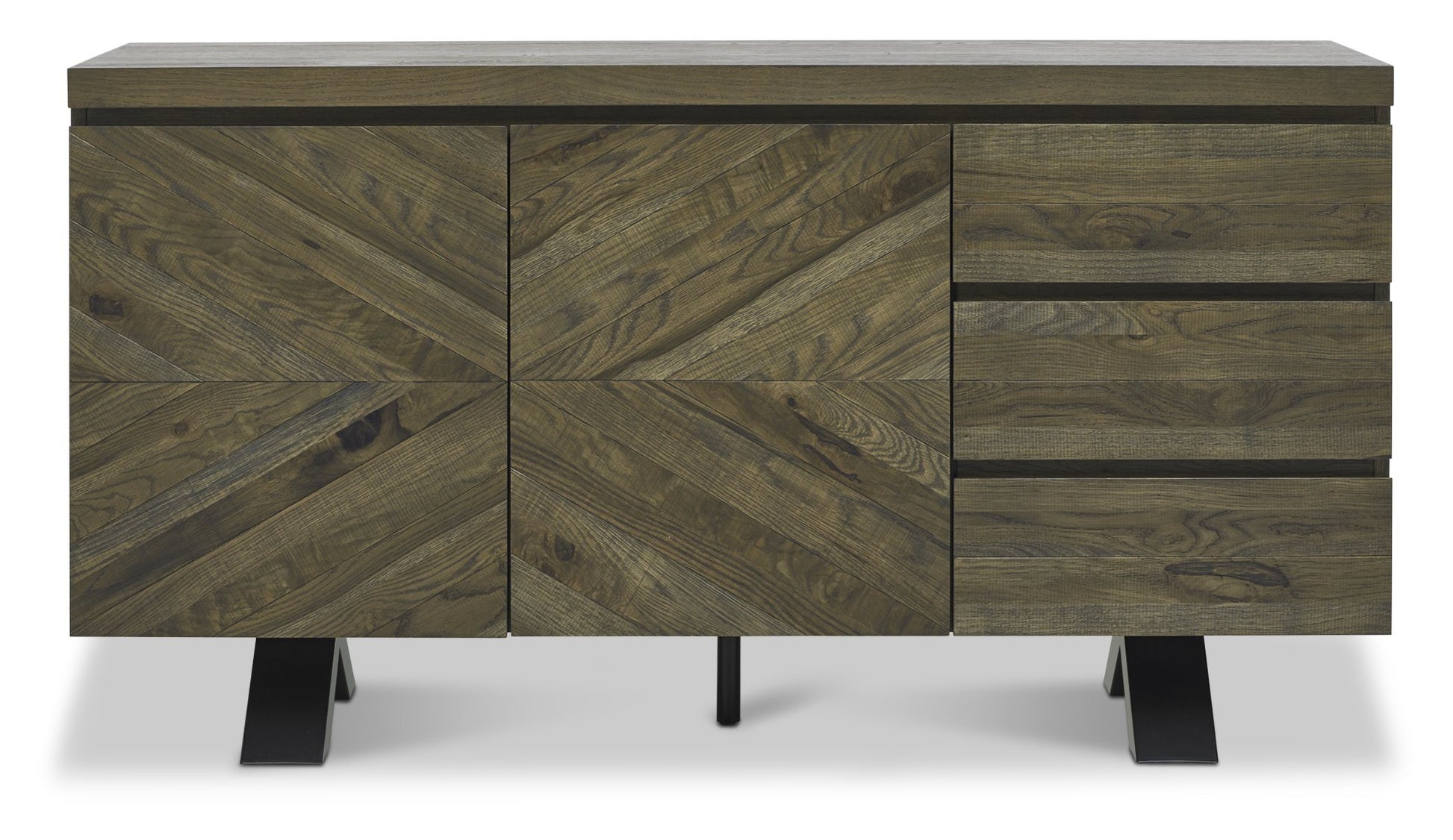 llipse Range available in both Rustic Oak & Fumed oak showcases bold design with a combination of the natural lines of the elliptical and circular tables, paired with the geometrical & linear shapes of the cabinet, to create a compelling and slightly eclectic look. The striking saw cut rustic oak marquetry tops on the thick table tops and cabinet doors contrast beautifully against the large welded peppercorn powder coated metal bases, creating a range that successfully blends intricate craftsmanship and indulgently warm tones with an on trend industrial aesthetic. Each of these hand-crafted pattern tops and laminated rustic oak cabinet frames are wire brushed and distressed to give a rustic look and tactile feel, making the most of the beautiful and varied grain of oak. Generously proportioned dining chairs, styled with diamond stitch upholstery in a choice of luxurious dark grey fabric and old west vintage bonded leather, feature plush padded seats, gently flared backs and elegantly tapering legs, imbuing comfort and indulgence. Superior Blum soft close drawer runners add that final quality detail to a range that is sure to be a focal point in any space.