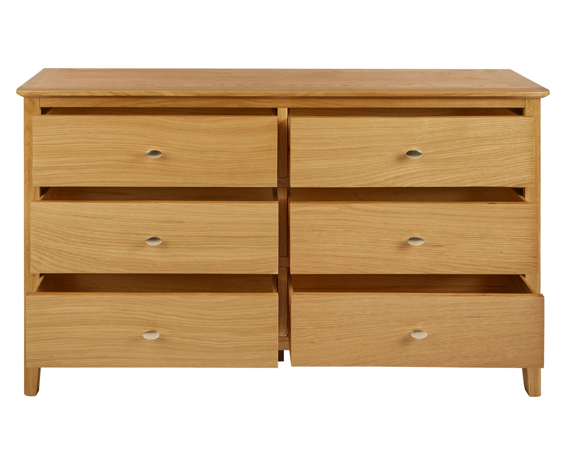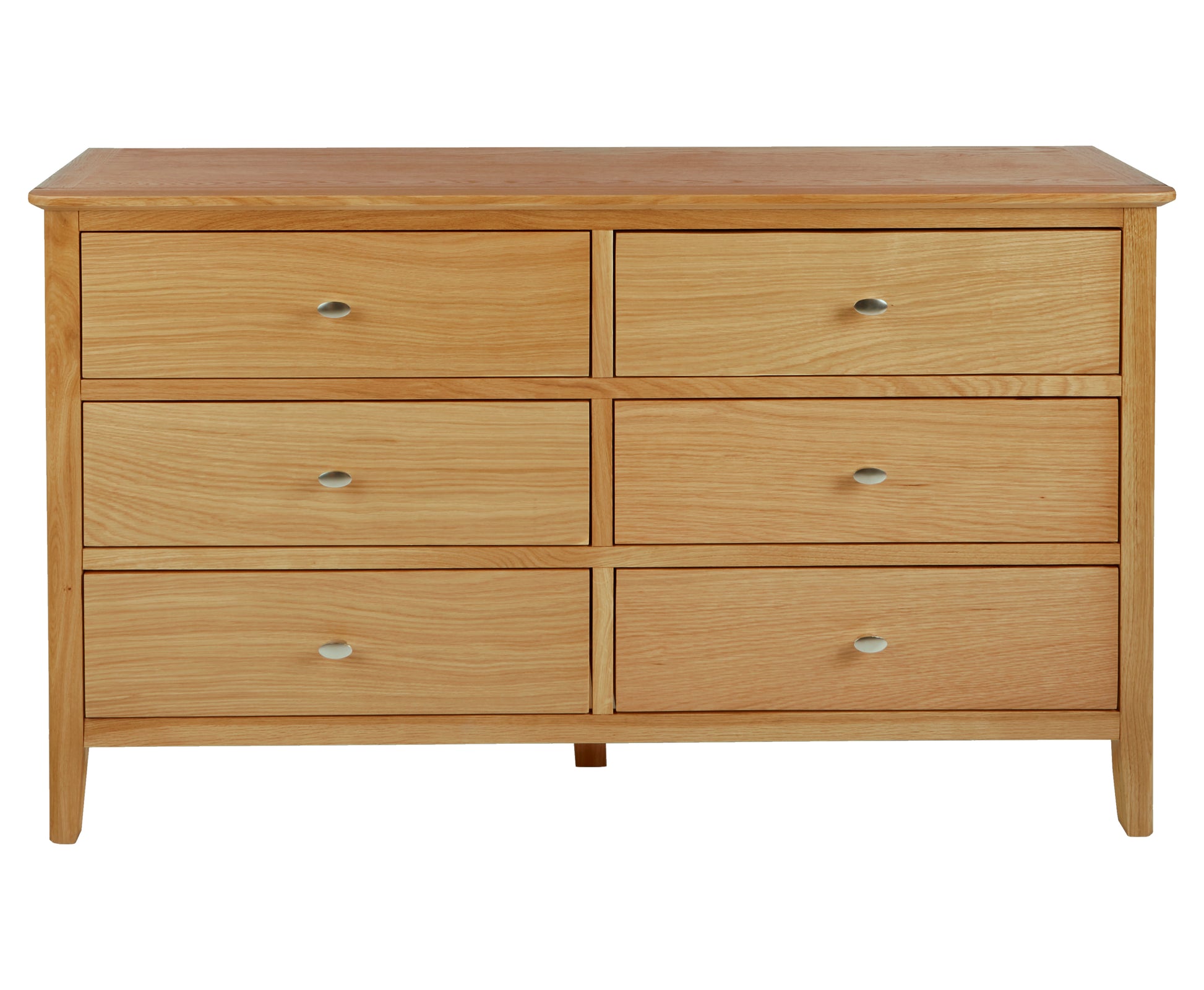 Bath Oak 3+3 Drawer Chest is a perfect solution for everyday necessities. This Drawer Chest has solid oak material with pale oak finish and satin silver handles to bring a touch of simple elegance, ensuring you'll enjoy its beauty for many years. The curved corners and tapered legs add to the beauty of the range. Bath Drawer Chest has smaller drawers and larger drawers which is excellent for bedroom storage. This Drawer Chest has wide large top surface is a great place to display ornaments and family photos.