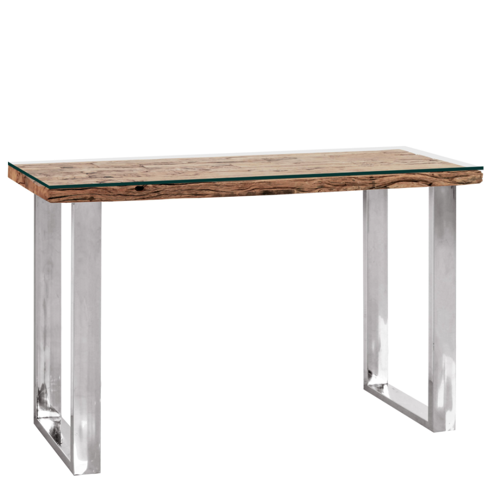 Experience luxury and exclusivity with the Indus Valley Railway Sleeper Console Table. Crafted from reclaimed sleeper wood, each plank boasts a unique texture and look. Its toughened glass top and polished stainless steel legs provide a perfect contrast, adding both stability and industrial charm to the piece. Measuring H 76cm x W 130cm x D 40cm, with a leg height of 70cm, this console table will make a sophisticated statement in any space. Packaged in two boxes, with dimensions of H 15cm x W 140cm x D 45cm and H 7.5cm x W 139.5cm x D 49.5cm, this piece is a must-have for those seeking elegance and style in their home decor.