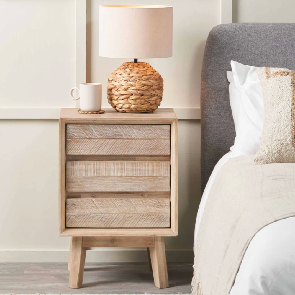 The Kalmar sand-wash acacia wood 3 drawer bedside unit is an ideal complement to any bedroom. Its sleek, compact design effortlessly integrates with your current décor. Use a pair on either side of the bed for balanced style and