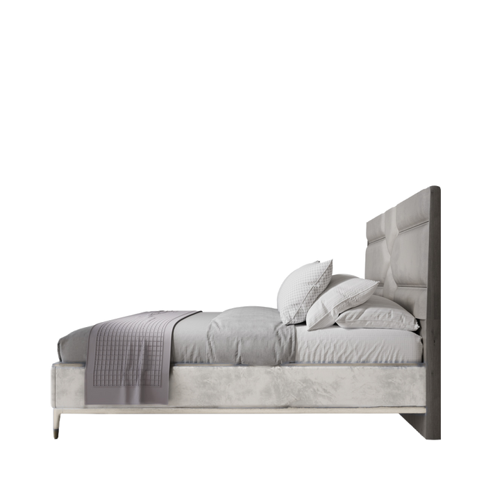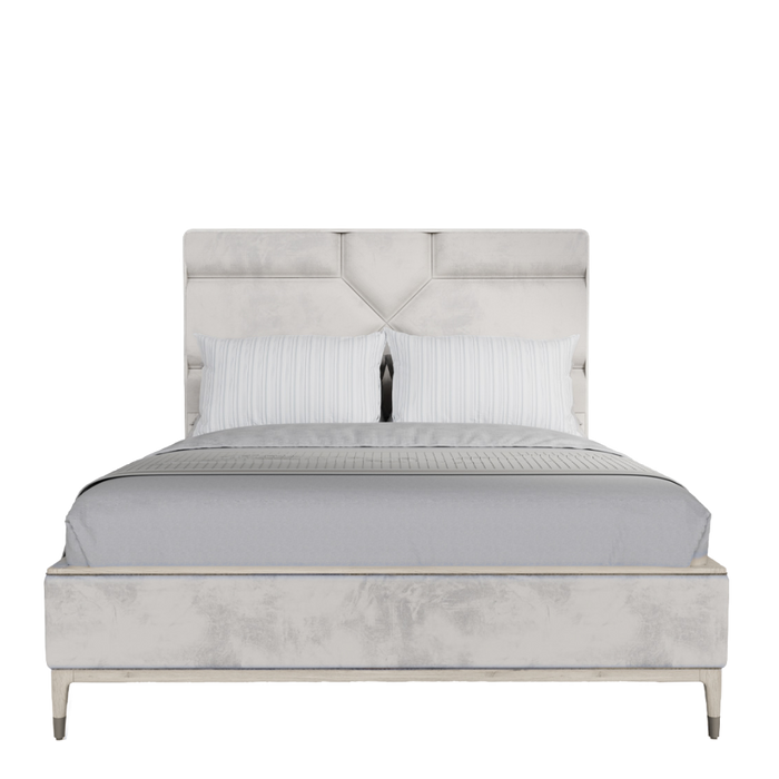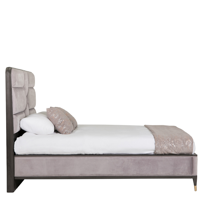 The Kensington 5ft Bed in Stone – a luxurious centrepiece for your bedroom. Inspired by Art Deco design, this bed exudes elegance and sophistication. Adorned with brushed gold metal hardware and inlay, it adds a touch of opulence to your space. Crafted with Stone-coloured wood and upholstered in ecru colour velvet, it offers both style and comfort.