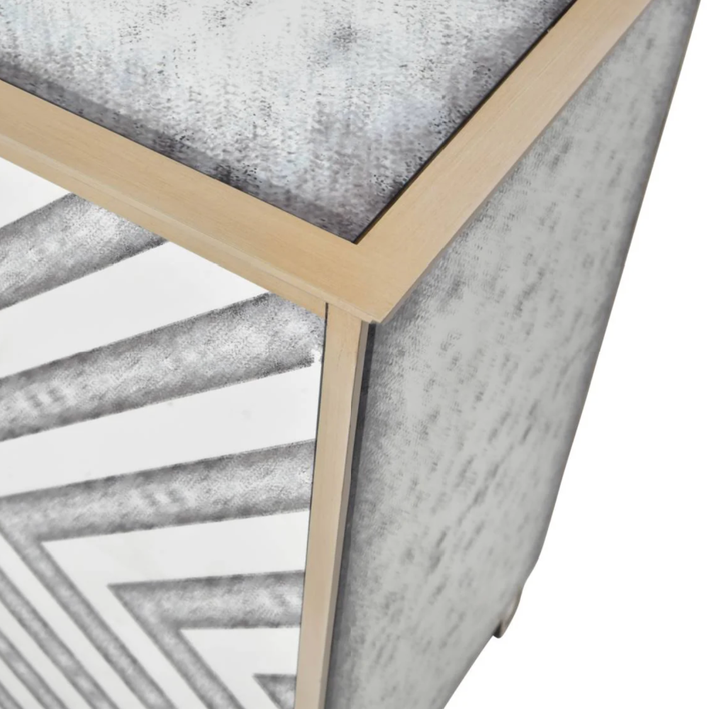 The Lexington bar cabinet features antiqued mirror panels, inset in a Champagne gold painted wooden and mdf frame. A mix of antiqued and clear mirror glass creates a timeless chevron design on each door panel. Doors are secured by a push latch mechanism to ensure a flush front surface. Each door is supported with three sturdy hinges. Inside the cabinet are two removable and adjustable shelves, each with a shelf height of 32cm. The top of this sideboard is a distressed mirrored panel, with a bevelled edge. This sideboard sits on four elegant mirrored legs. Other items in our Lexham collection include the Lexham Bar Cabinet and Lexham Wall Mirror.