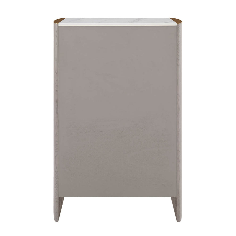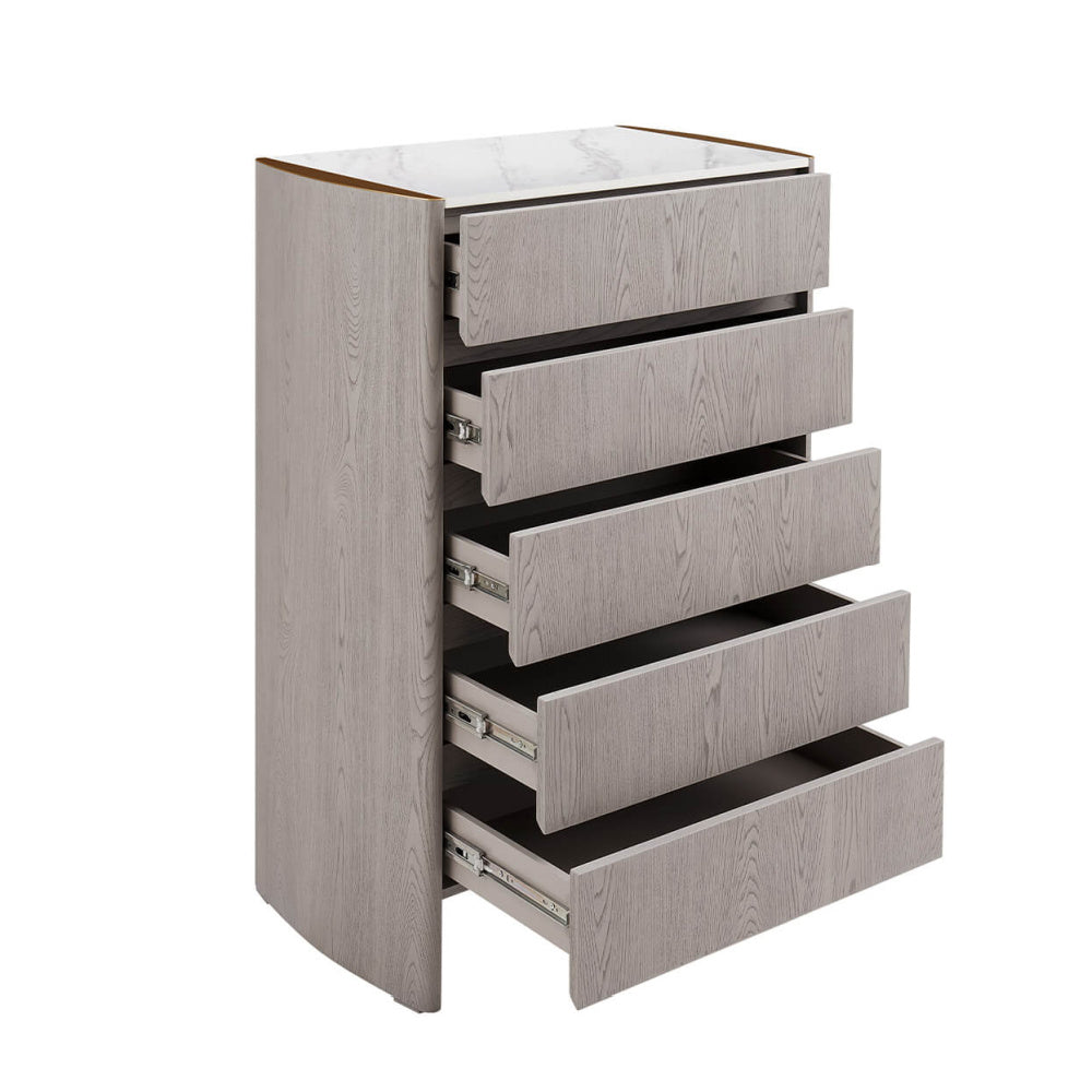 Mondello 5 Drawer Tall Chest in Washed Oak blends elegant design with everyday functionality. Featuring a durable elm veneer and a stainproof, antibacterial, scratch-resistant and waterproof sintered stone top edged in brushed stainless steel, it offers five spacious drawers for organised storage. With its luxurious finish and easy-to-clean surfaces, it's a sophisticated and practical choice for modern bedrooms.