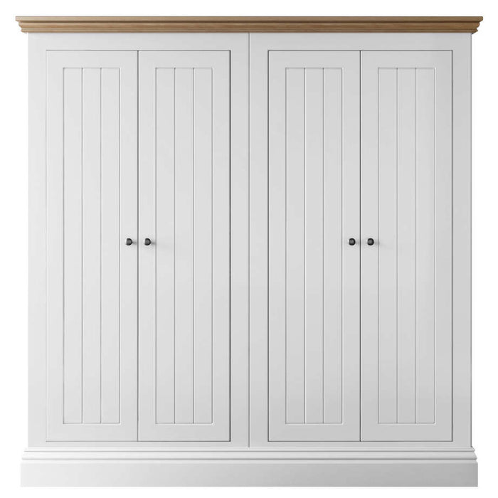 This wardrobe combines two compact two-door units side by side, unified by a common base and top to look like one seamless piece. Offering ample storage space, it’s also available with drawers underneath or as an extra tall model measuring 2160mm. We can customize the wardrobe to your exact size requirements—just give us a call, and we’ll gladly discuss your needs.