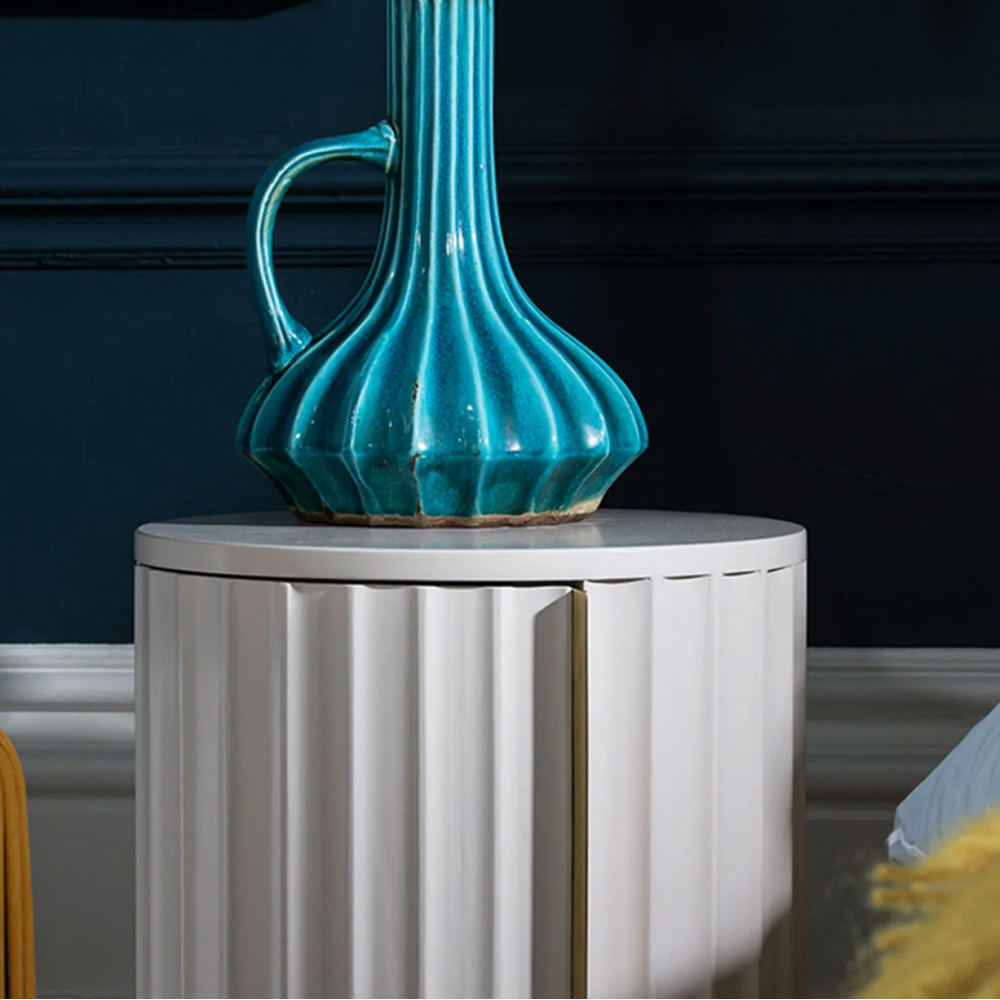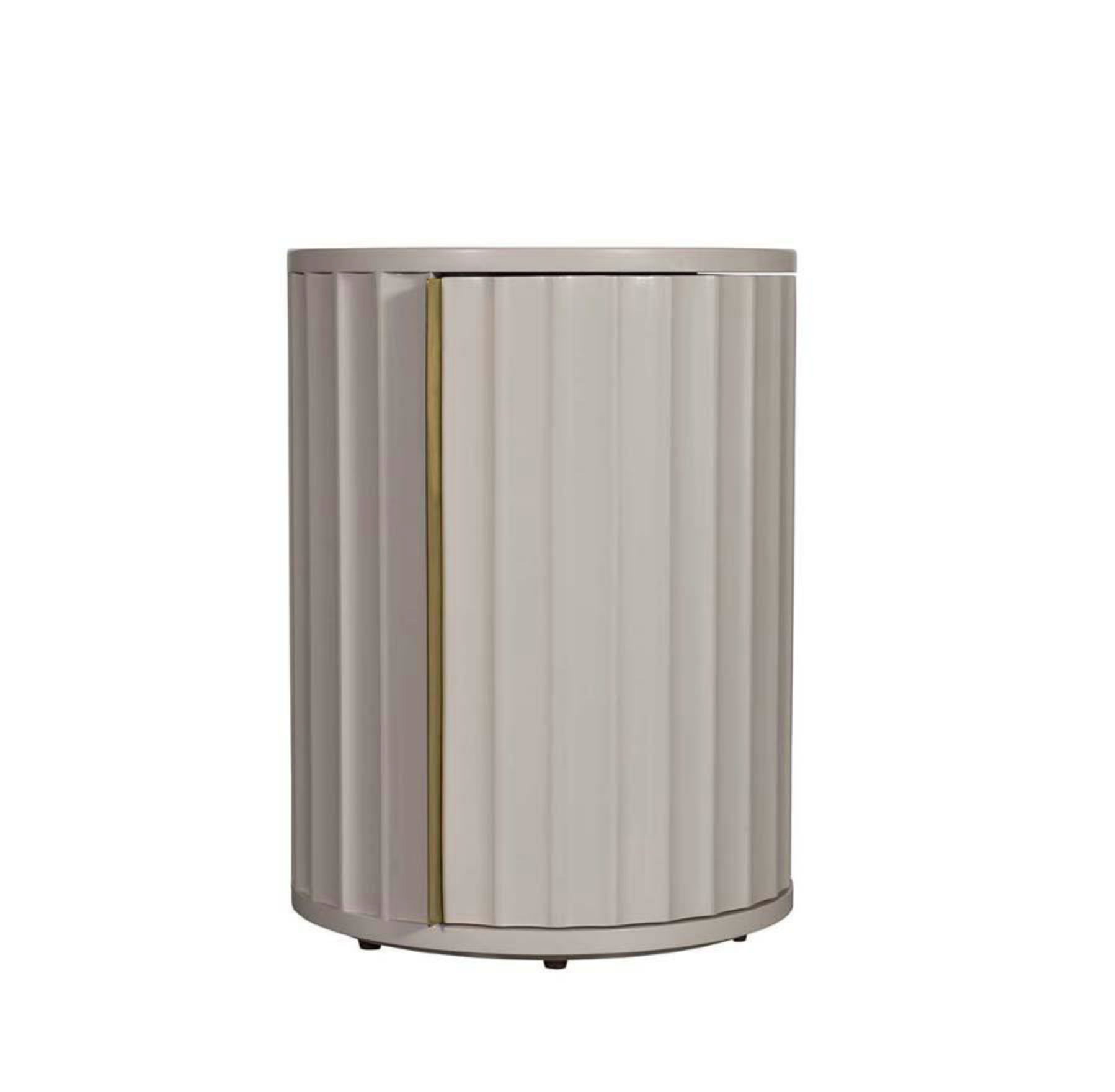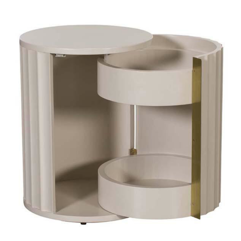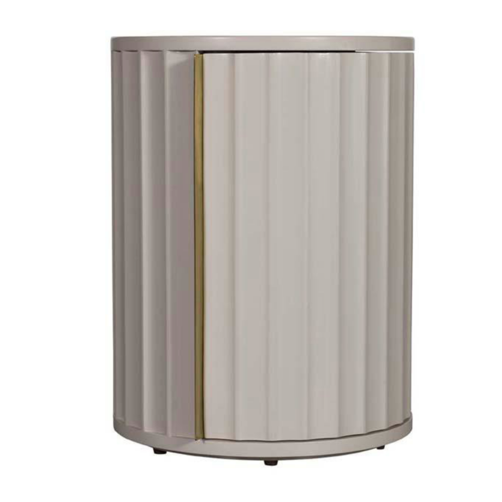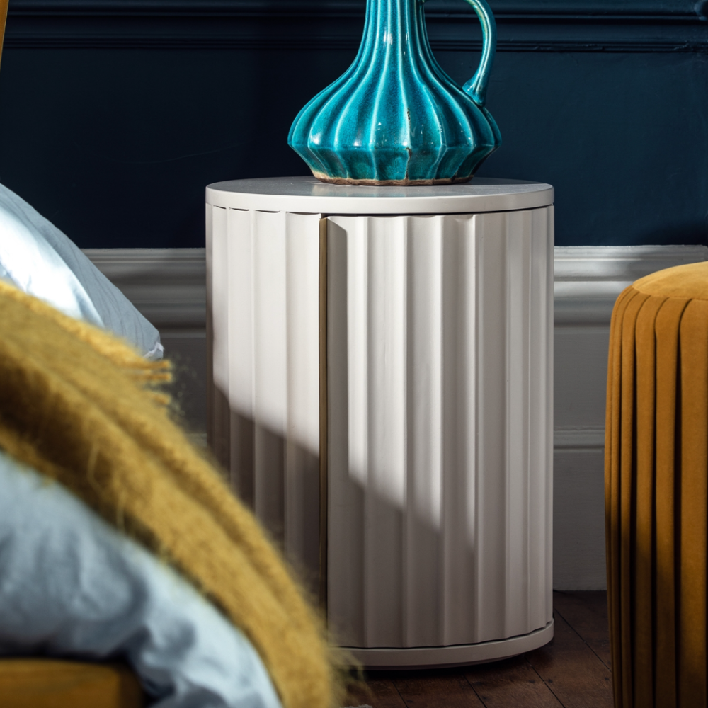 The Lily Bedside Table Left is a gorgeously unique unit with retro 1920's styling. The unit is round with a corrugated front that features a smooth fold out and roll opening drawer revealing the inner storage shelves. The bedside table is crafted from mahogany which is painted in chic ivory and the beautifully elegant gold coloured accent handle adds chic style. This delightful table offers storage for all your night time belongings and will look lovely next to your bed holding a simple lamp. Combine with other items from the Lily range for a unified aesthetic.