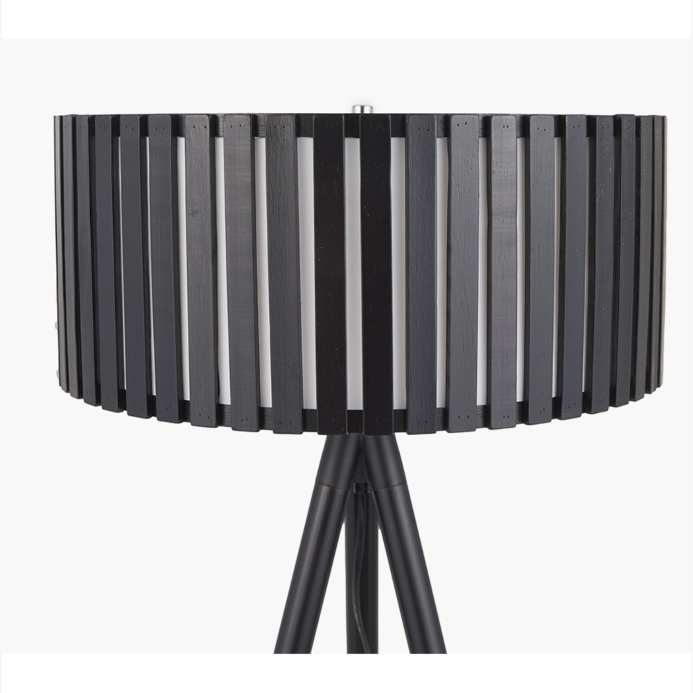 Sleek, modern tripod design, this lamp is finished in a striking black colour. A wooden slatted shade elegantly diffuses the light whilst the tripod element gives this floor lamp a contemporary edge.