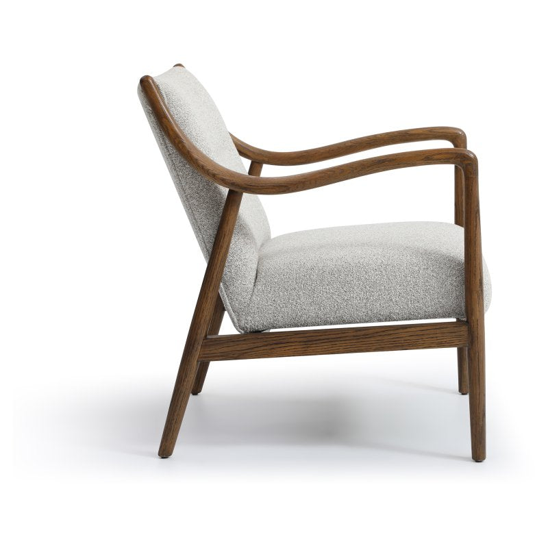 Tarquin Chair Item: KY508 Curved solid oak frame with high arm rests for comfort in a soft grey boucle fabric. Relax in style with this elegant Tarquin Chair. Designed with a curved solid oak frame and high arm rests, our chair provides the utmost comfort and sophistication. Covered in a soft grey boucle fabric, it's a luxurious piece that will elevate any living space.
