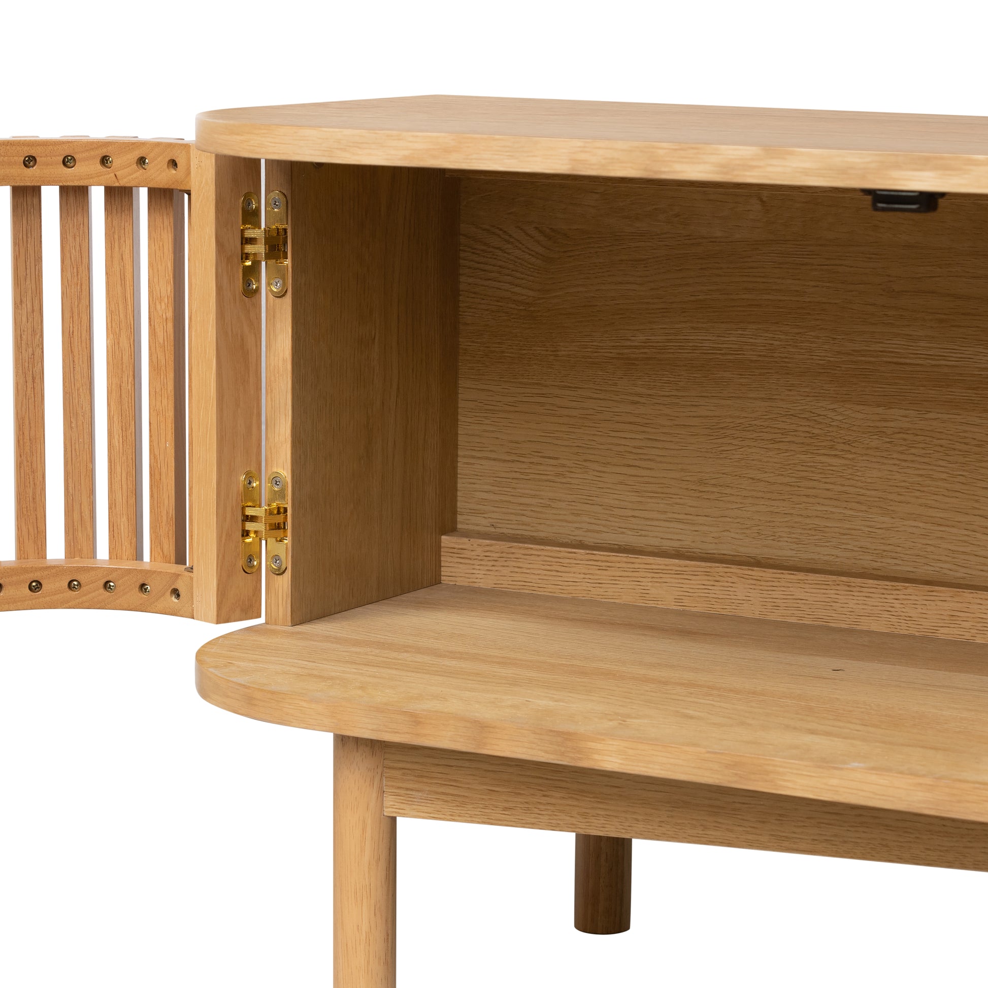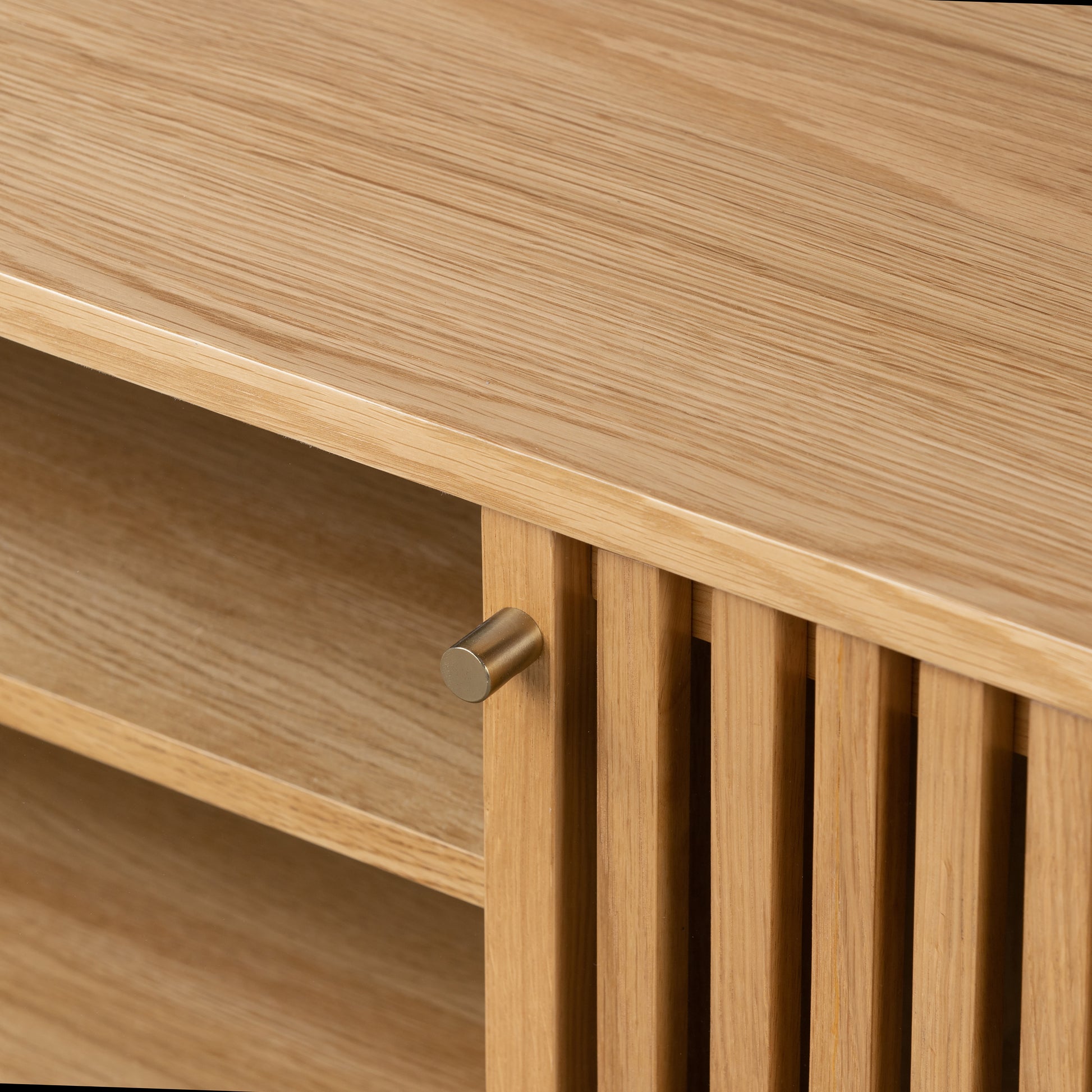 Straight slatted front contrasted with gentle curved edges. The slatted feature on the doors gives the design a lightness, a hint of texture and a distinguishing finish that will stand out in your living space. Beautifully simply gold handles bring the range to life while keeping the frame minimalist and streamlined.