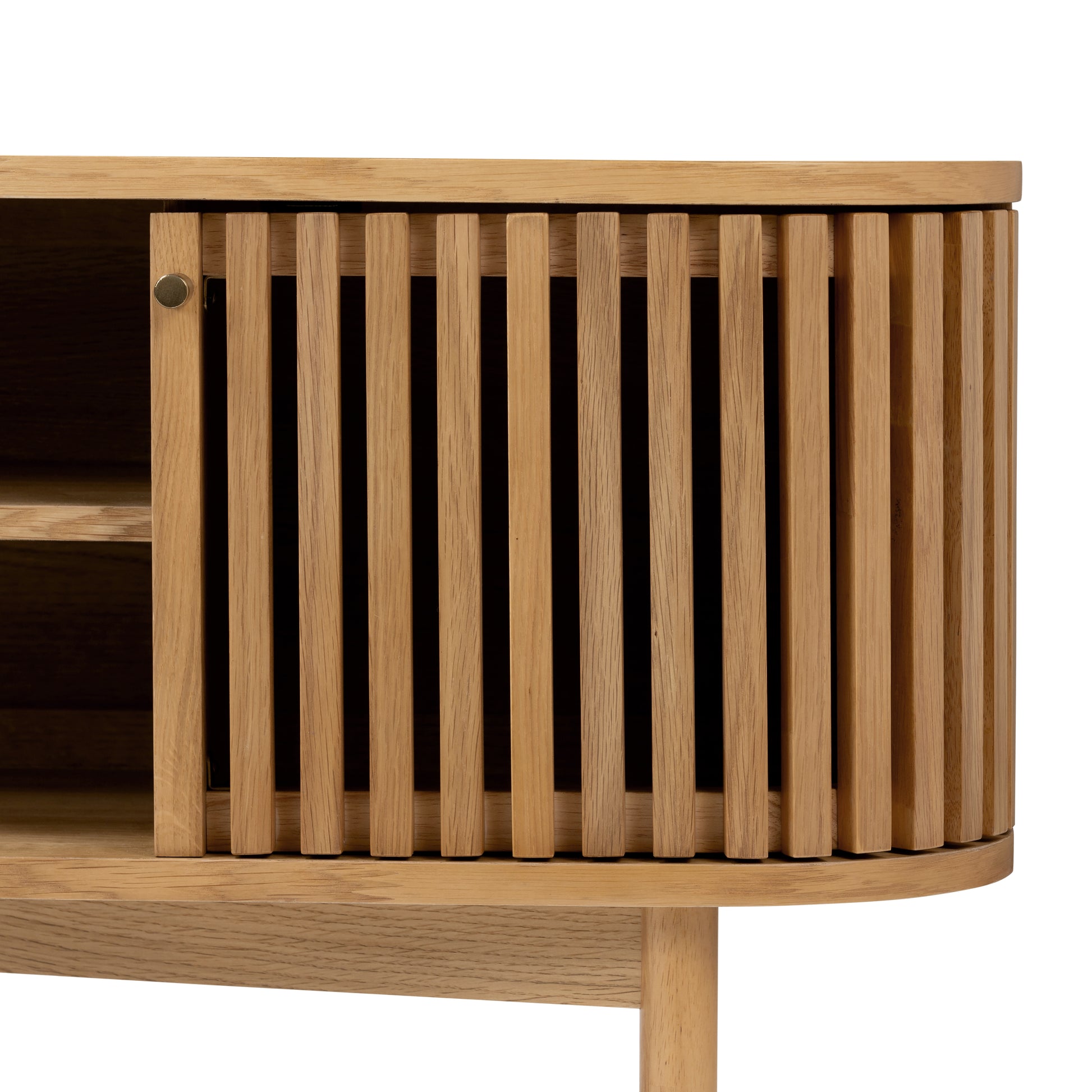 Straight slatted front contrasted with gentle curved edges. The slatted feature on the doors gives the design a lightness, a hint of texture and a distinguishing finish that will stand out in your living space. Beautifully simply gold handles bring the range to life while keeping the frame minimalist and streamlined.