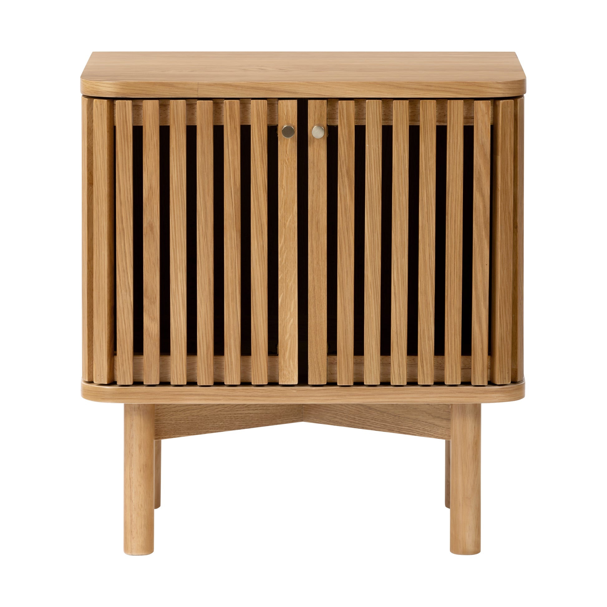 Straight slatted front contrasted with gentle curved edges. The slatted feature on the doors gives the design a lightness, a hint of texture and a distinguishing finish that will stand out in your living space. Beautifully simply gold handles bring the range to life while keeping the frame minimalist and streamlined.