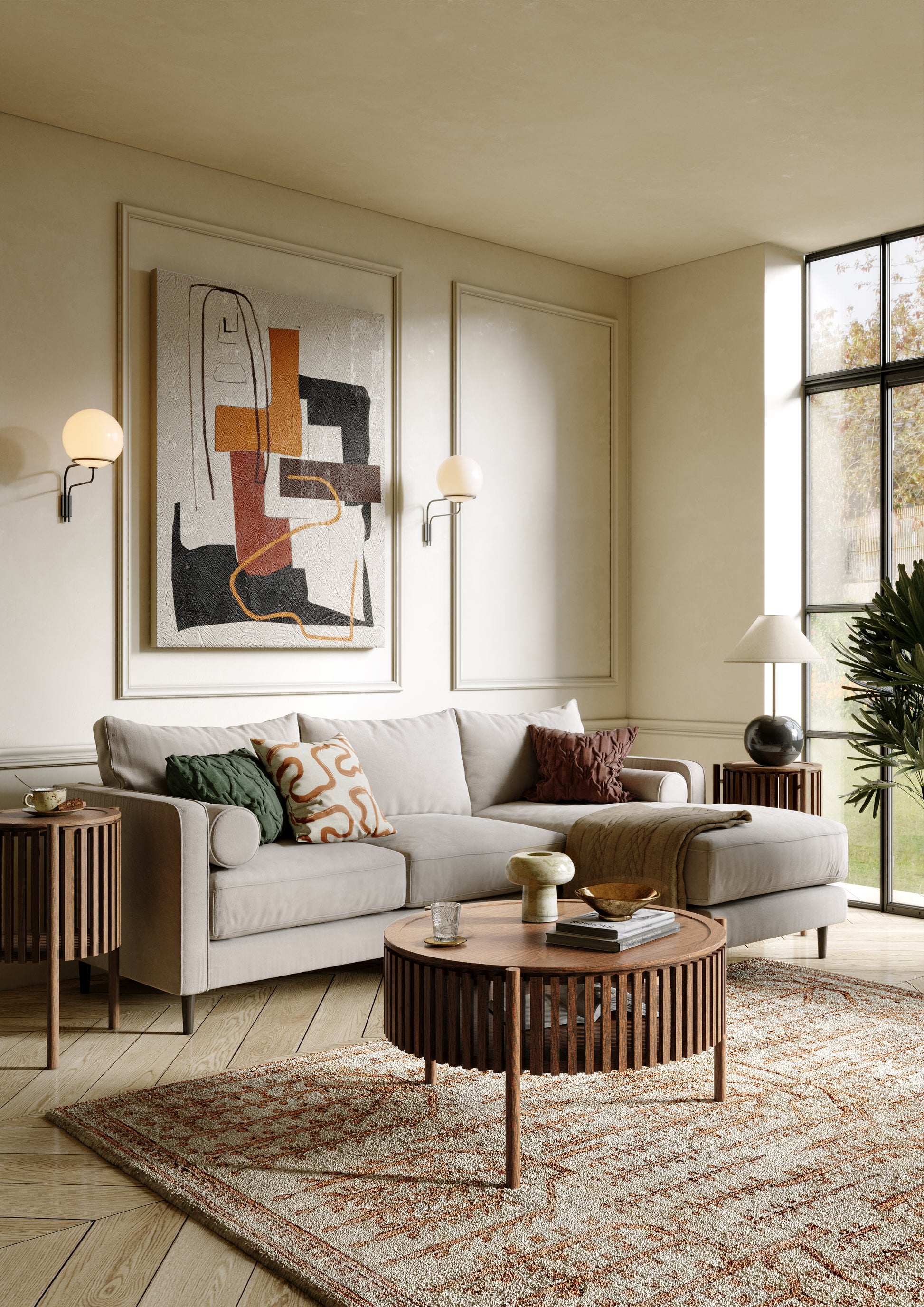Straight slatted front contrasted with gentle curved edges. The slatted feature on the doors gives the design a lightness, a hint of texture and a distinguishing finish that will stand out in your living space. Beautifully simply gold handles bring the range to life while keeping the frame minimalist and streamlined.