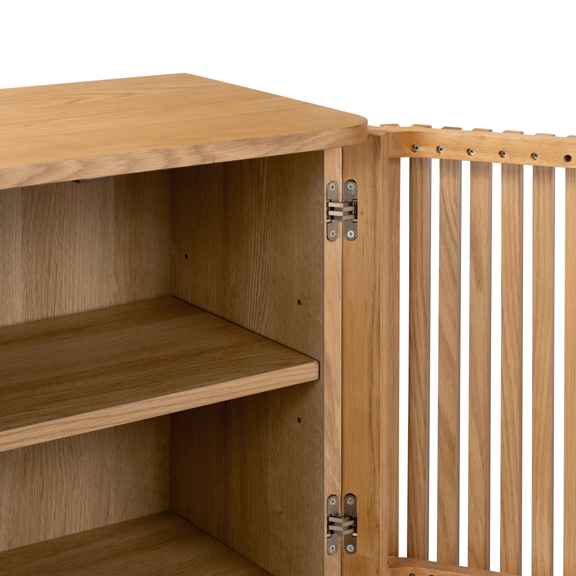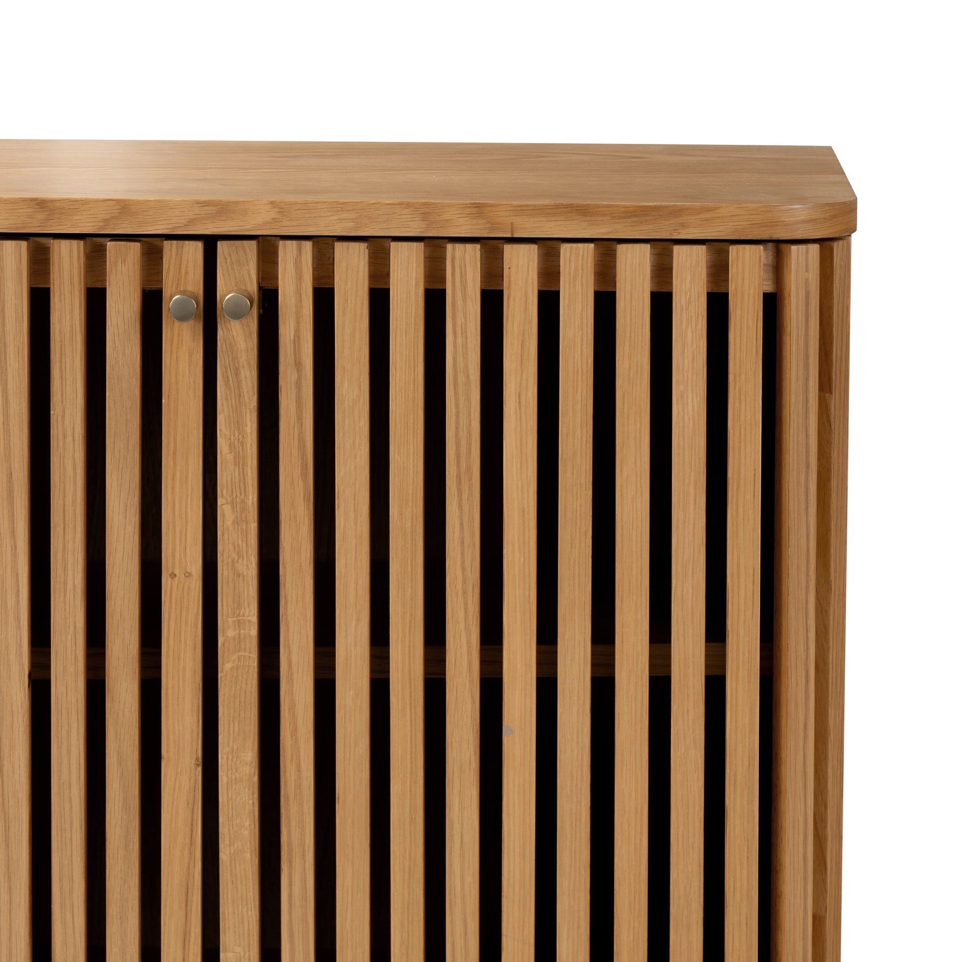 Straight slatted front contrasted with gentle curved edges. The slatted feature on the doors gives the design a lightness, a hint of texture and a distinguishing finish that will stand out in your living space. Beautifully simply gold handles bring the range to life while keeping the frame minimalist and streamlined.