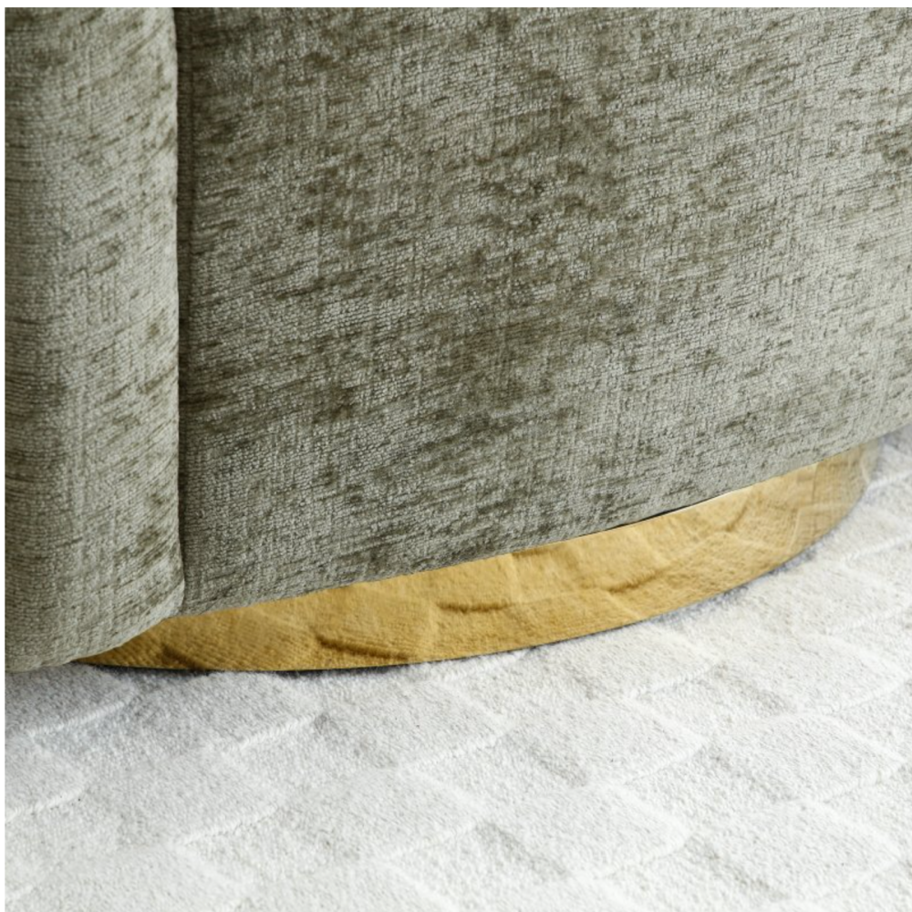 The Teddy Swivel Chair is a recent addition to our accent chair collection, upholstered in soft chenille. This tub-style chair features a wingback-inspired design with curved arms and sits on a gold swivel base. This product comes partially assembled.