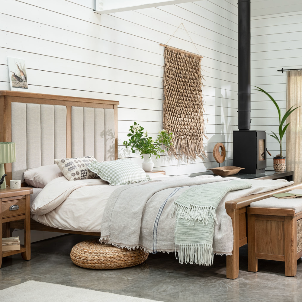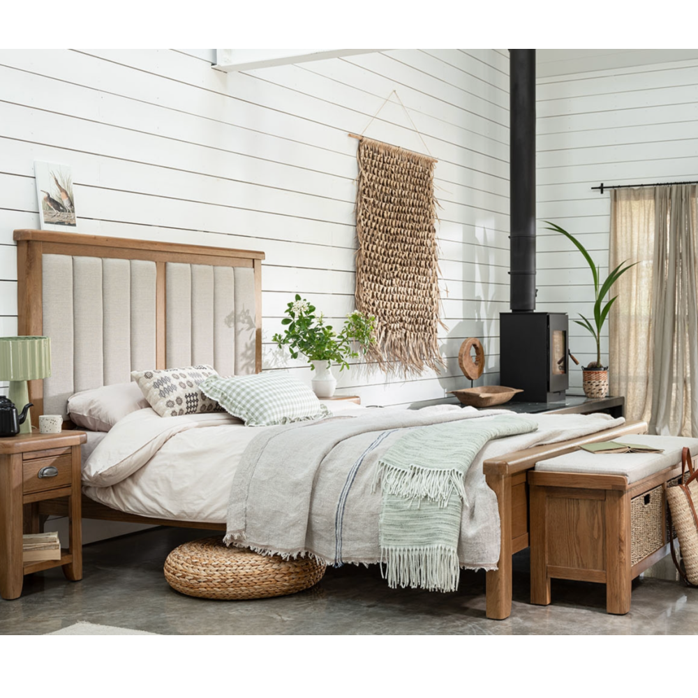 Imbue your bedroom with timeless warmth and natural character by adding our Smoked Oak Bedroom Range to your space. Meticulously crafted from solid oak, each piece boasts a beautifully smoked finish that exudes refined rustic charm. With elegant wood grain detailing and sturdy construction, this collection balances modern simplicity with classic craftsmanship. The bedframe features a vertical paneled, fabric headboard and low footboard for both support and minimalist appeal. The spacious chest of drawers offers ample storage with smooth-glide drawers and traditional cup handles, while the compact yet practical bedside table boasts a drawer for nighttime essentials and a solid oak top for your favorite lamp or book. The generously sized wardrobe is designed with hanging space and internal shelving to keep your clothing organized and your bedroom clutter-free. Embrace the beauty of natural textures and understated elegance with the versatile Smoked Oak Bedroom Range, perfect for both contemporary and rustic interiors.