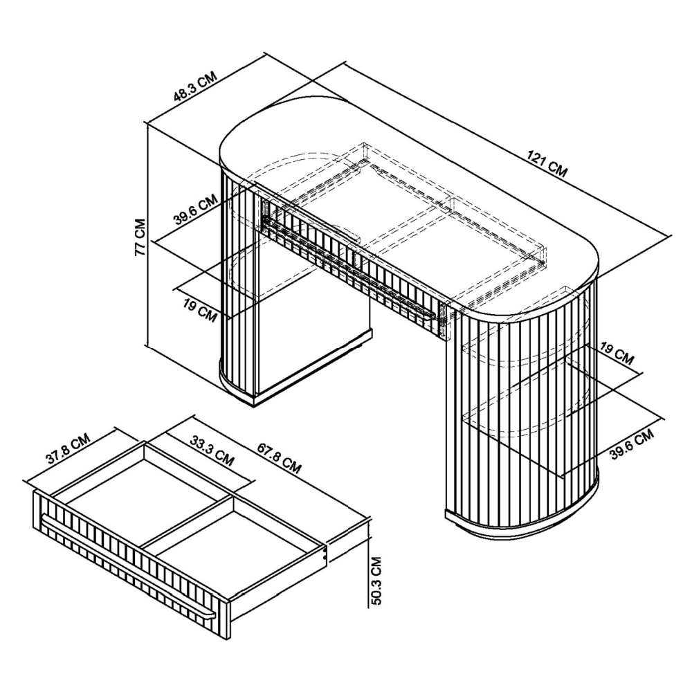 The Bentley Designs Vega Dressing Table offers a sleek, contemporary design with a crafted character. Finished in knotty oak veneers with a soft weathered tone, it features expressive grain, subtle curves, and delicate groove detailing. A central drawer provides practical storage, while shelving concealed within its pillar-like sides adds a thoughtful, streamlined touch. Perfectly balanced in form and function, it pairs beautifully with the Vega stools and mirrors.