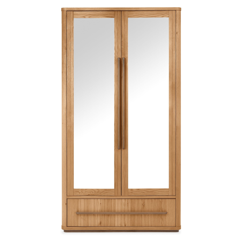 The Bentley Designs Vega Double Wardrobe combines contemporary style with generous storage. Crafted from knotty oak veneers in a soft weathered finish, it features expressive grain, subtle curves, and fine groove detailing for a cohesive look. Twin mirrored doors add light and depth to the room, while the spacious interior and deep lower drawer provide practical everyday storage.