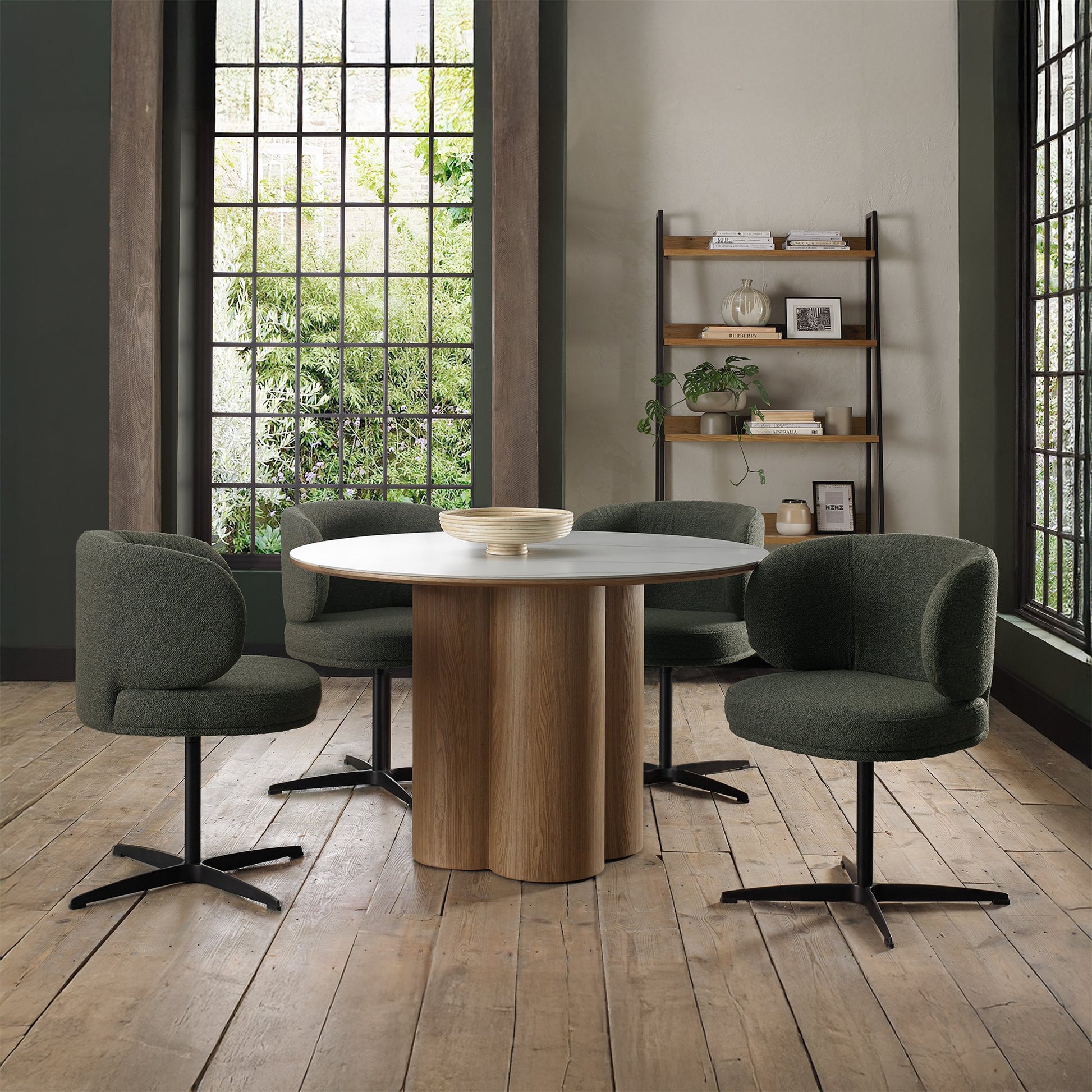 Effortlessly blending form and function, the Warren Dining Table offers a refined solution for space-conscious interiors. A smooth 6mm matt white sintered stone top offers everyday durability, while the bold pedestal base in black oak or natural oak engineered veneer introduces sculptural definition and warm contrast. Ideal for relaxed dining in a modern setting.