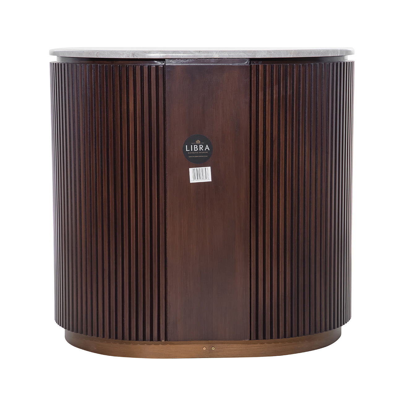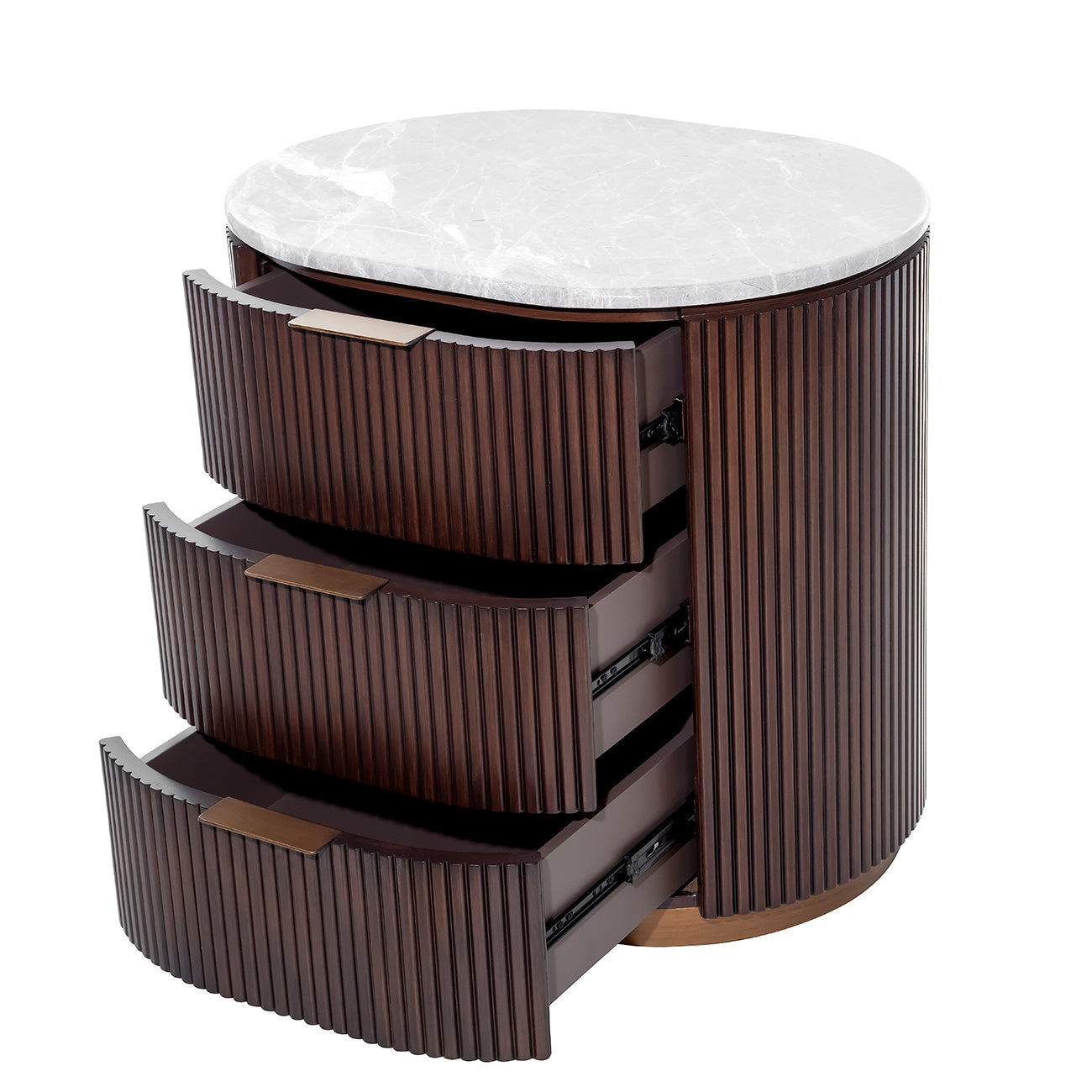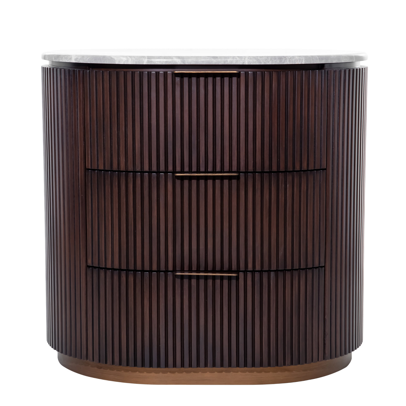 A compact yet sculptural piece, the Whitwell Single Bedside balances rich materials with a quietly bold profile. The pebble grey marble top offers a softly honed surface, with each one displaying natural tonal and veining variation. Crafted from solid rubberwood for strength and finished in deep walnut, the curved fluted frame conceals three generous drawers with antique brass handles. A matching antique brass base adds subtle lift and warmth. This is a functional storage piece with refined character. Explore the full Whitwell collection, including a Coffee Table, Two Door Cabinet, Dining Table, Three Drawer Chest, Desk and Console Table. W66 x D53 x H64 cm. Drawer size W38.5 x D39 x H12cm.