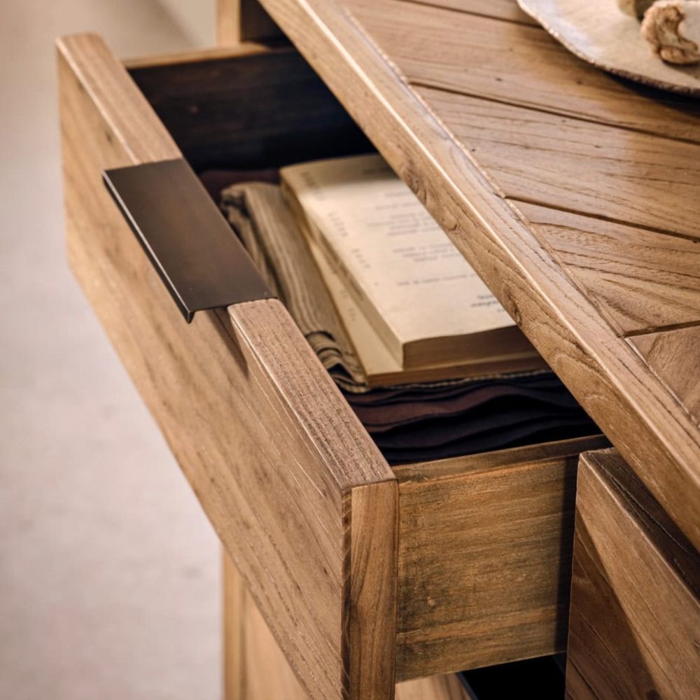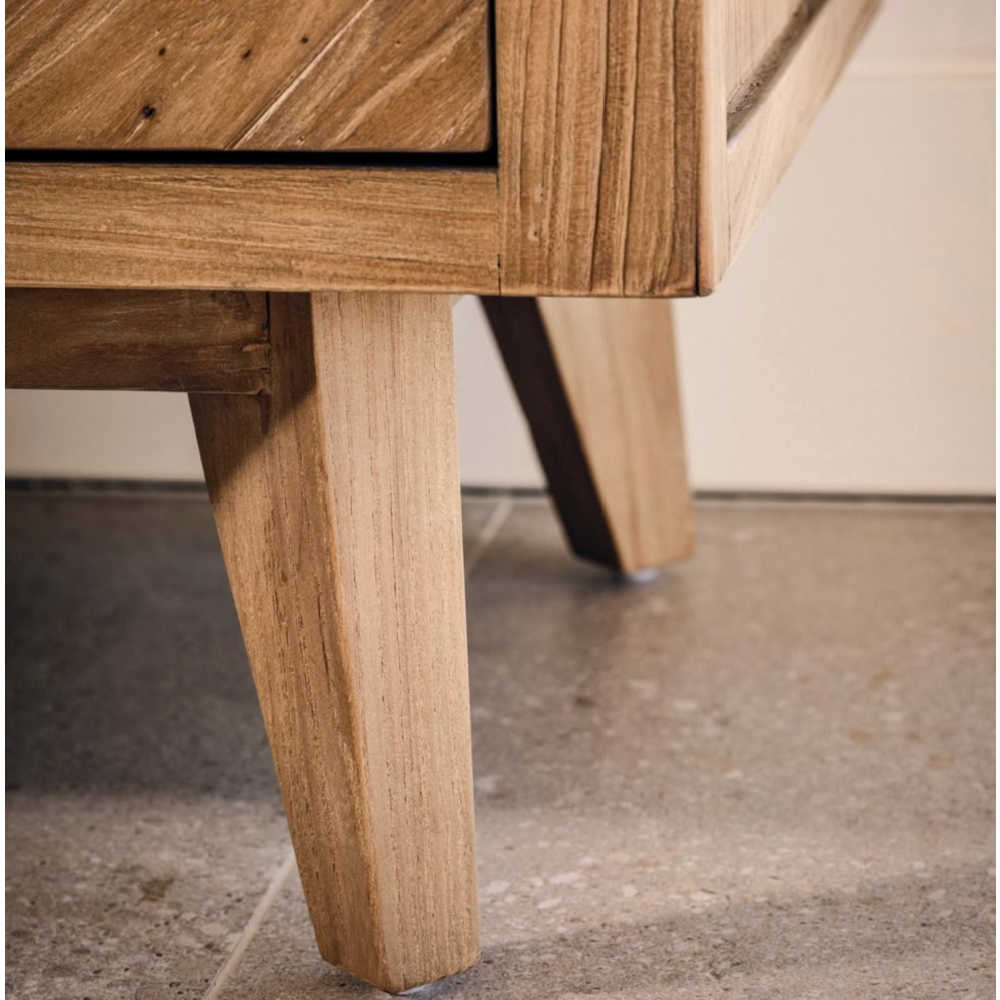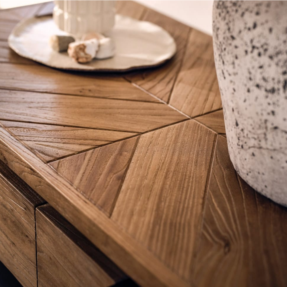 The Sorrento sideboard from Willis & Gambier offers superb storage options for any living space as well as having a striking & eye catching design. The cupboard doors have chevron timber fronts which frame the central tower of 3 drawers perfectly. Standing on neat legs it is lifted from the floor creating a more airy & uncluttered look. The timber tone is rich & warming clearly showing off the distinctive natural grain. This is an ideal piece for a busy home as there is so much storage inside combined with a broad top ideal for pictures, sound systems or TVs to stand upon.