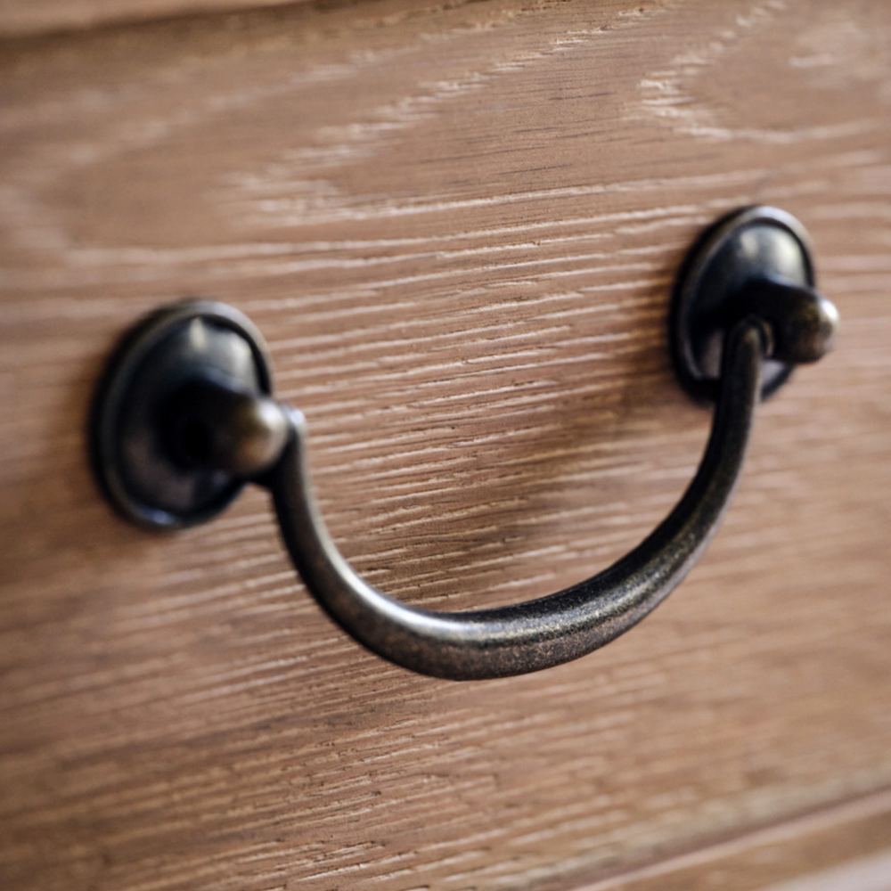 Every piece of furniture is individually crafted by skilled artisans. Oak solids and veneers are carefully selected for their distinctive grain character. The rich, warm hues of the timber are achieved through the patient application of multiple layers of lacquer by hand, beautifully offset by the aged pewter finish of the hardware.