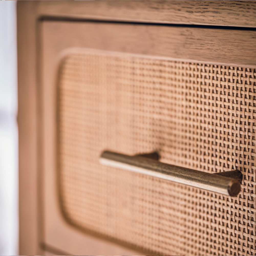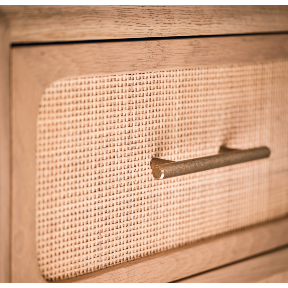 Radiused, mitred corners on the oak drawers and doors are subtly contrasted by the woven rattan in a warm, natural palette. Linear burnished brass pull handles complete the look.